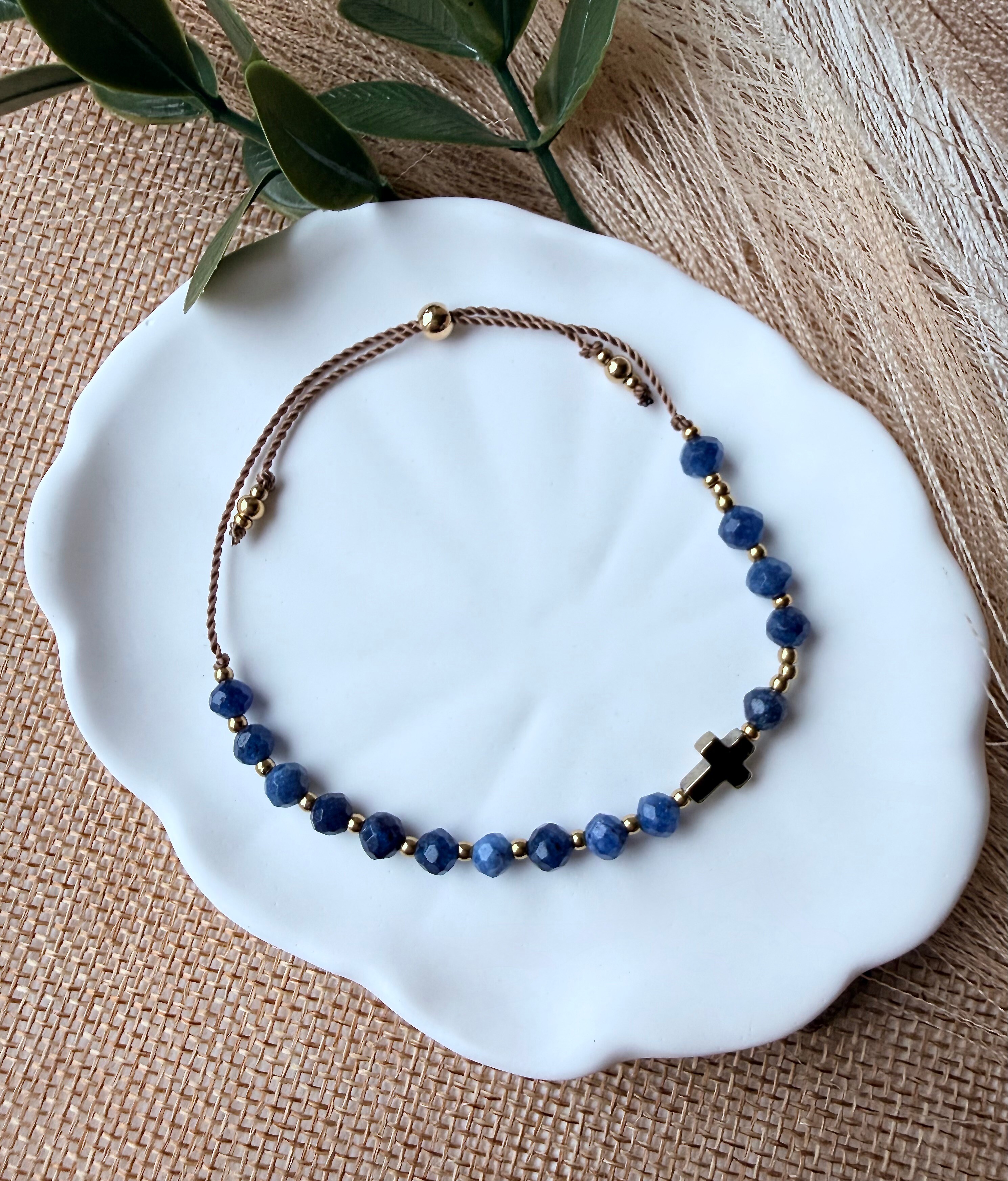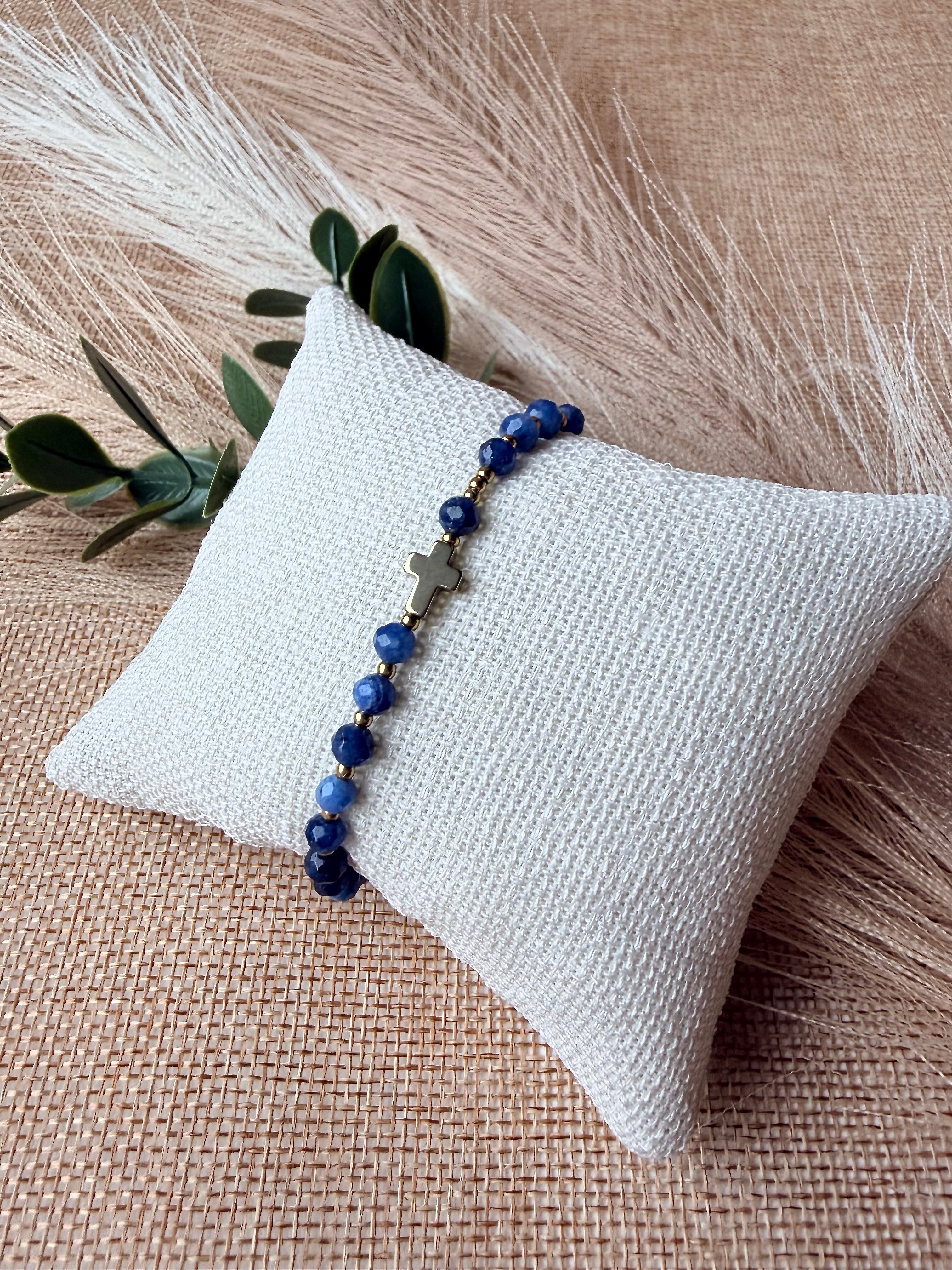 Krzyżyk ze złotego hematytu, który pięknie kontrastuje z błękitem.
