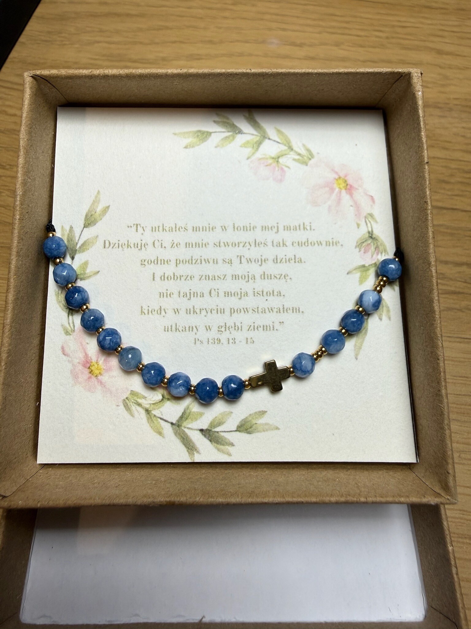 W komplecie znajdziesz pudełeczko oraz kartę z cytatem z Pisma Świętego.