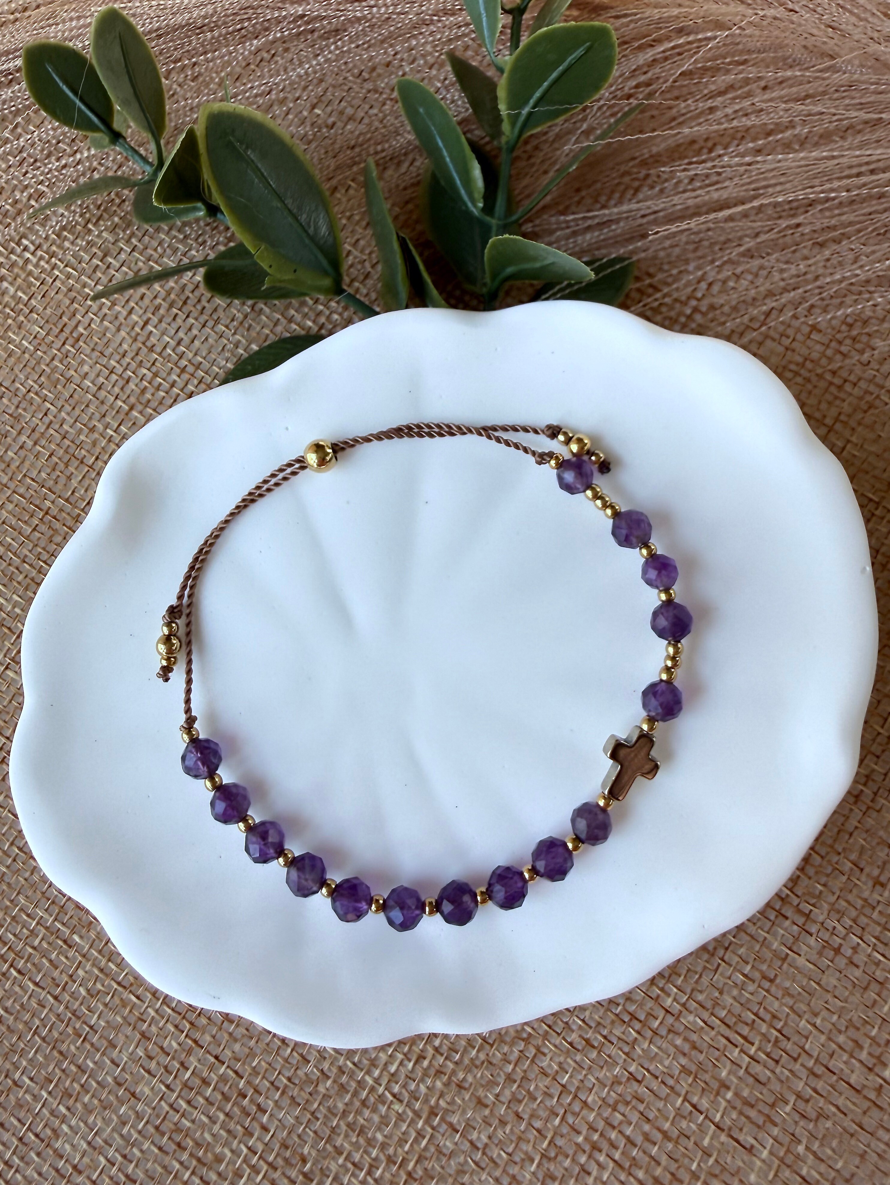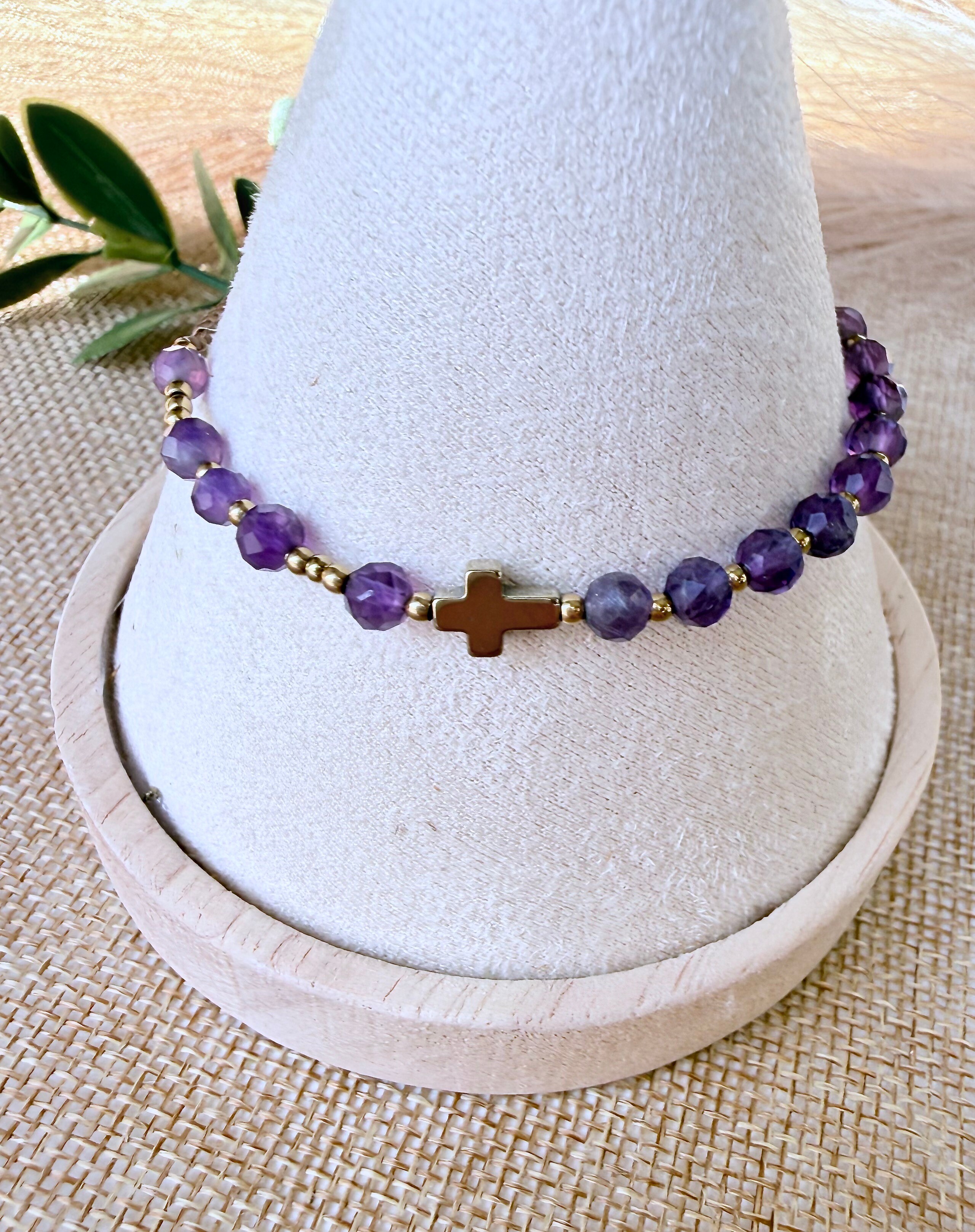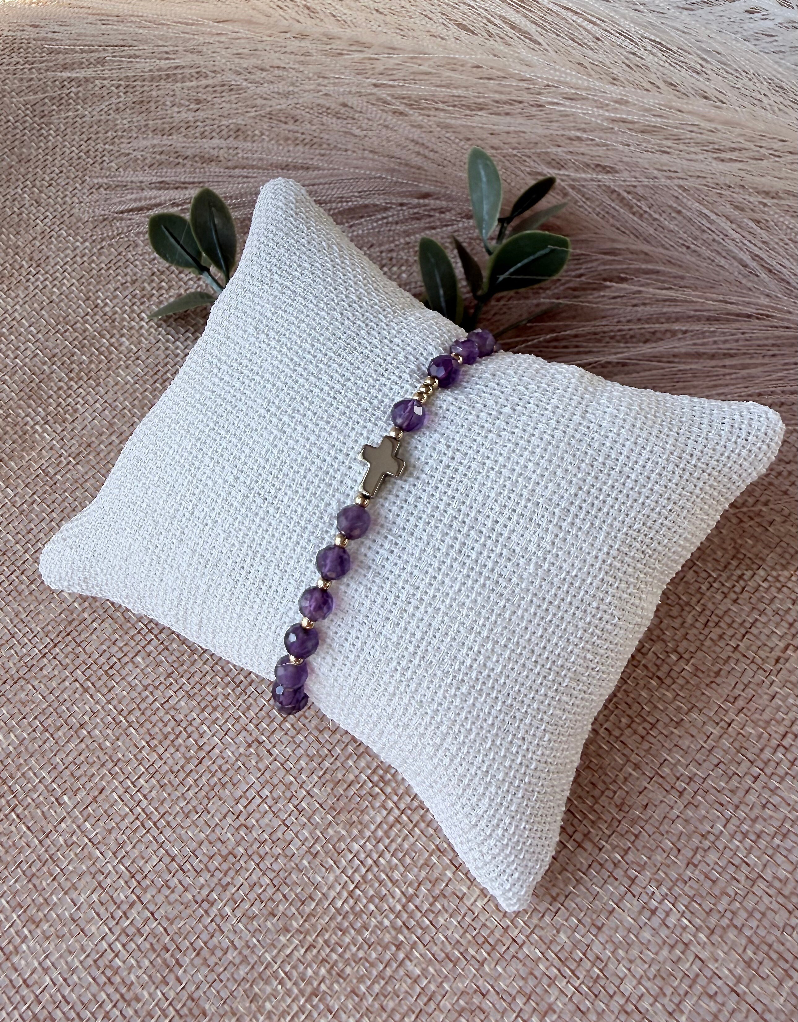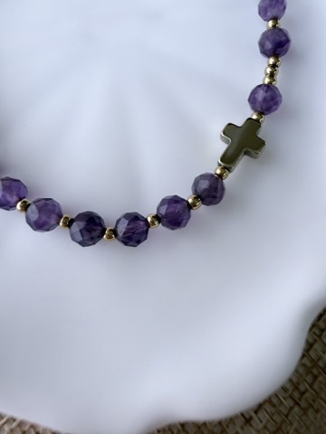 Złoty krzyżyk z hematytu, który idealnie komponuje się z chłodnym fioletem kamieni.