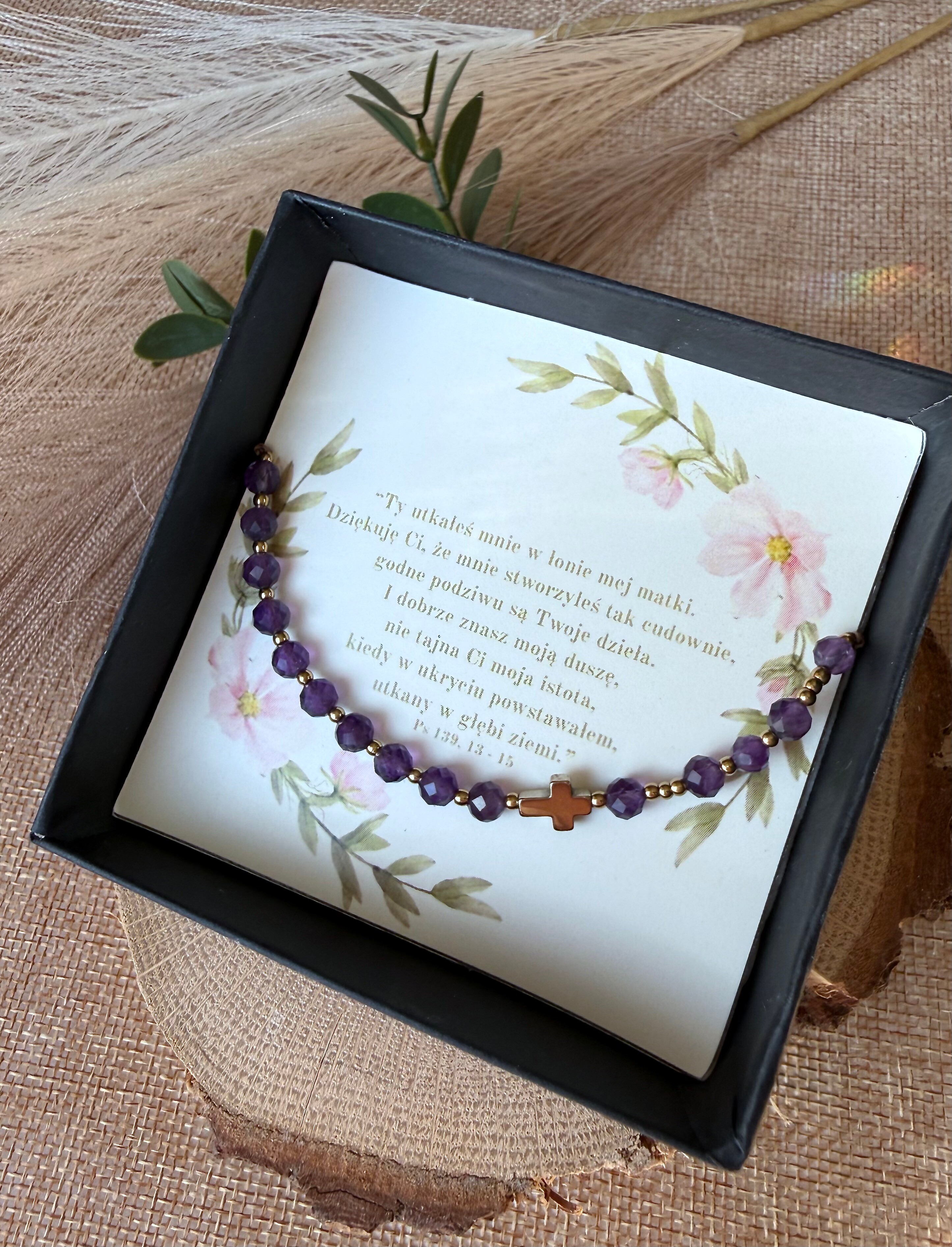 Wybrałam do tego modelu ametyst, ponieważ jest to kamień o niezwykłej głębi. Jego fioletowa barwa od wieków symbolizuje godność, modlitwę i przynależność do Królestwa Bożego. "Cicha Godność" to bransoletka dla kobiety, która szuka w wierze nie tylko emocji, ale i mądrości. Ametyst, będący jednym z biblijnych kamieni fundamentów Niebieskiego Jeruzalem, przypomina o tym, co trwałe i wieczne. Jego krystaliczna struktura pięknie chwyta światło, dodając Twojej codzienności odrobinę nienachalnego luksusu.