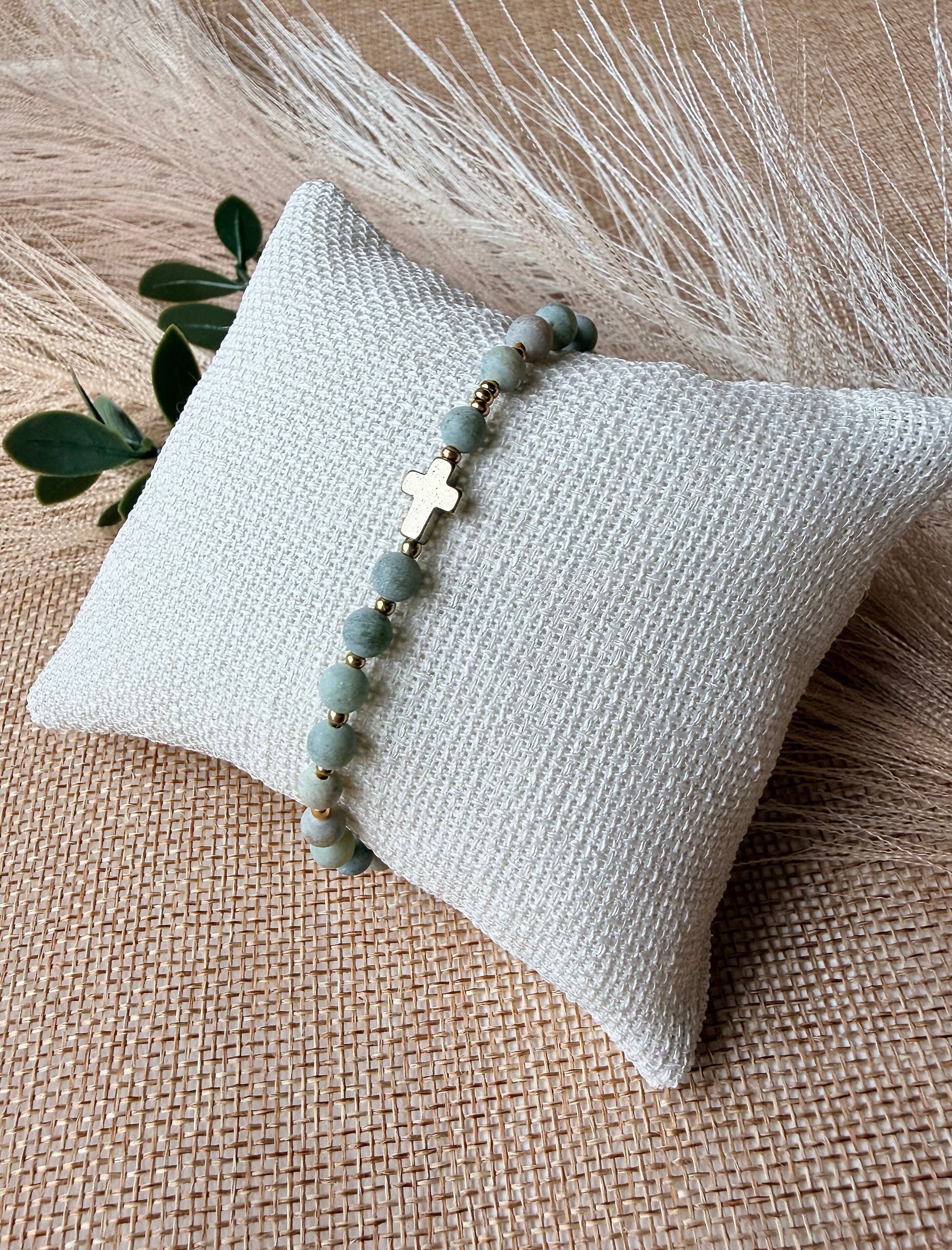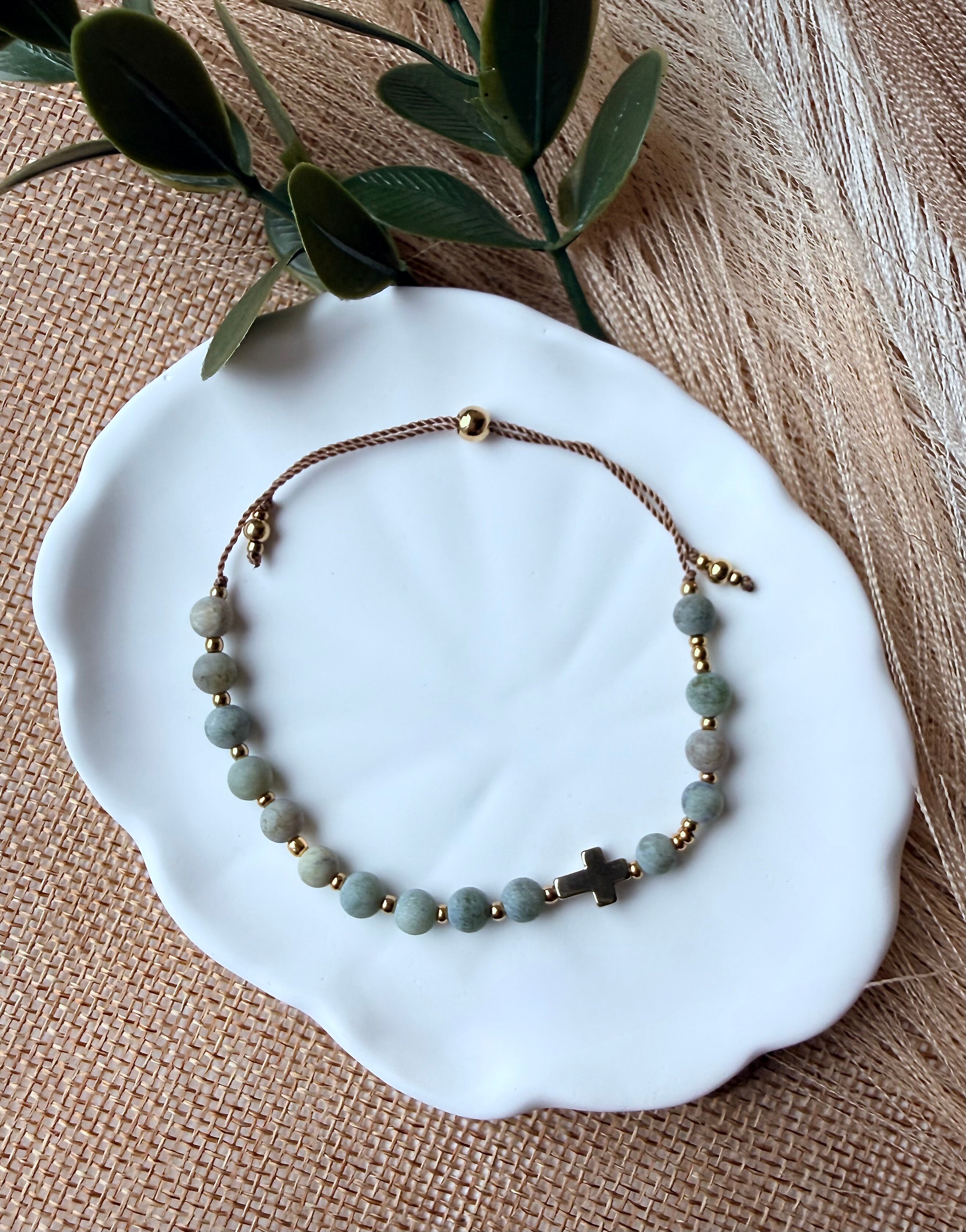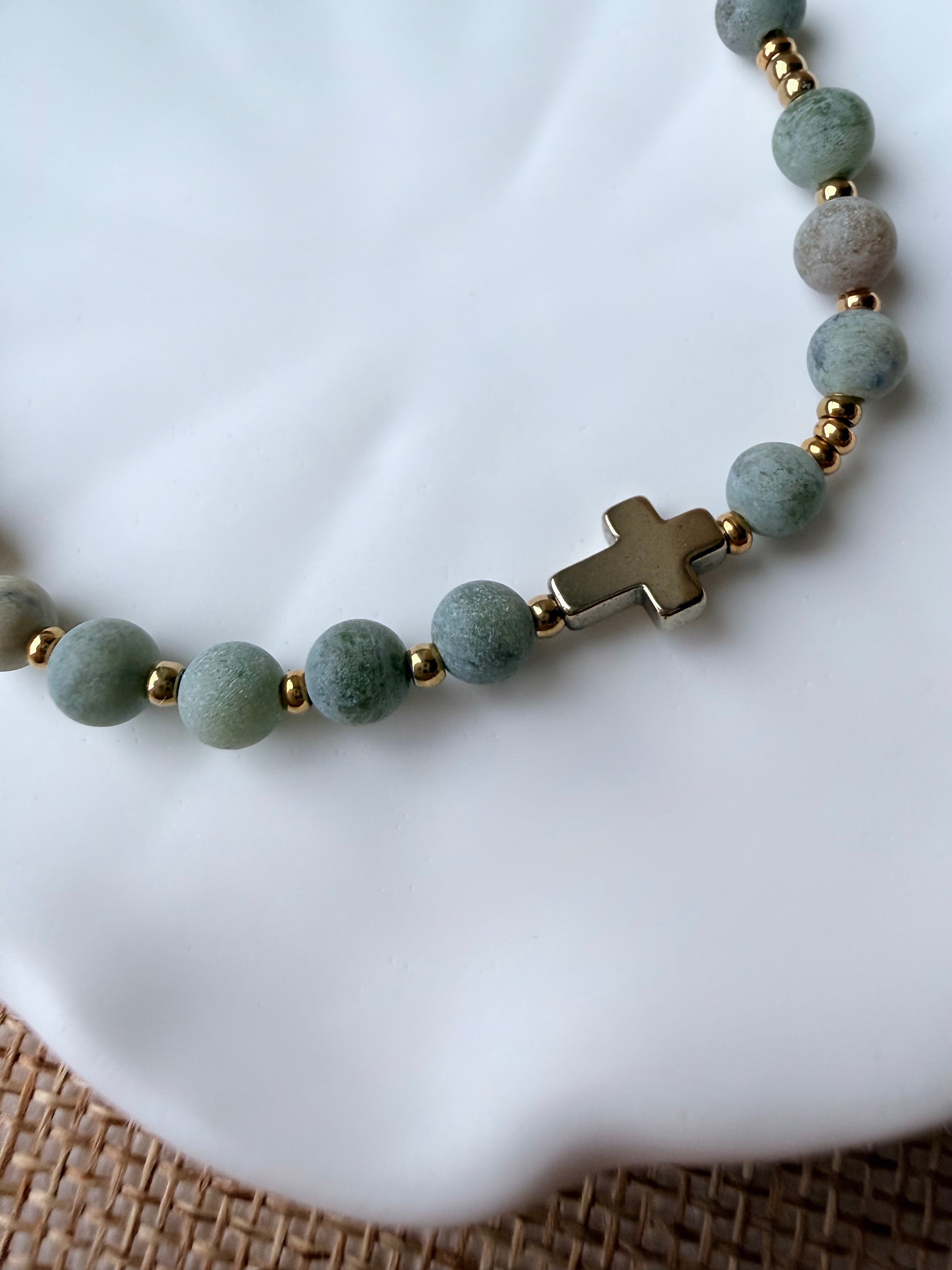 Złoty krzyżyk z hematytu, który pięknie kontrastuje z matową zielenią.