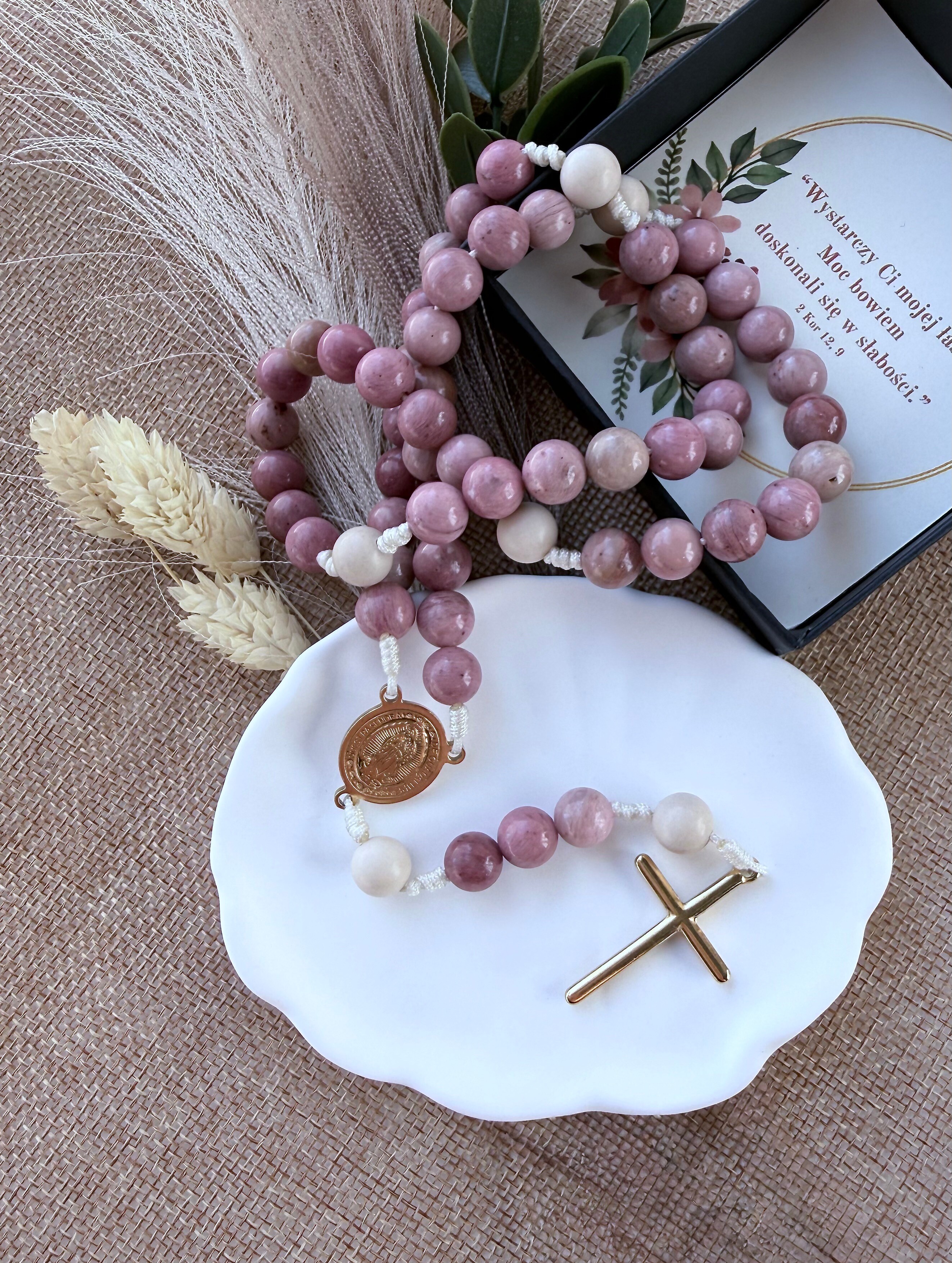 Unikalność natury: Każdy różaniec tworzę ręcznie specjalnie dla Ciebie. Ponieważ używam prawdziwych kamieni naturalnych, każdy egzemplarz jest absolutnie wyjątkowy. Kamienie mogą delikatnie różnić się odcieniem, układem użyleń czy kształtem od tych widocznych na zdjęciach. To gwarancja, że otrzymujesz produkt jedyny w swoim rodzaju!