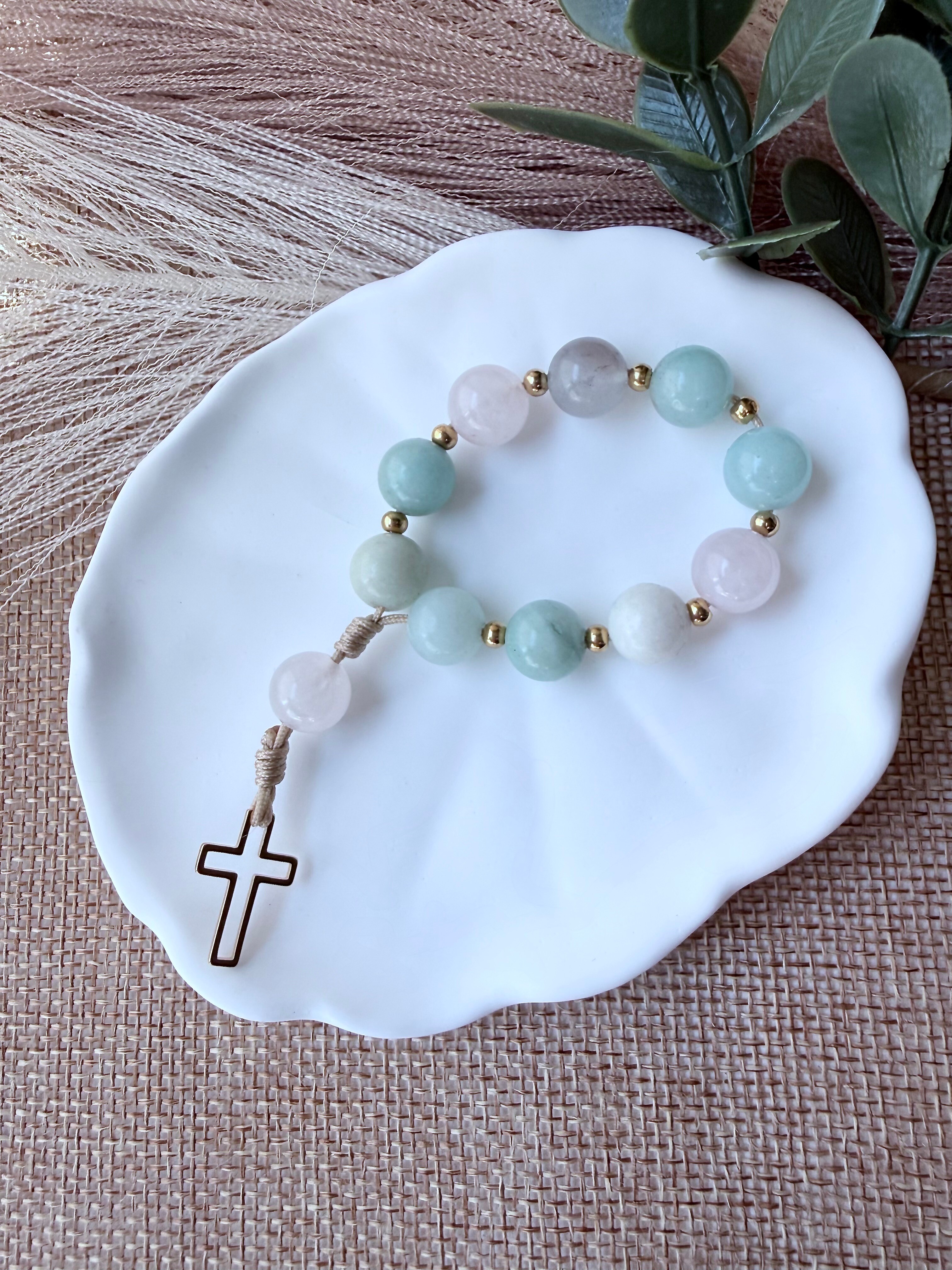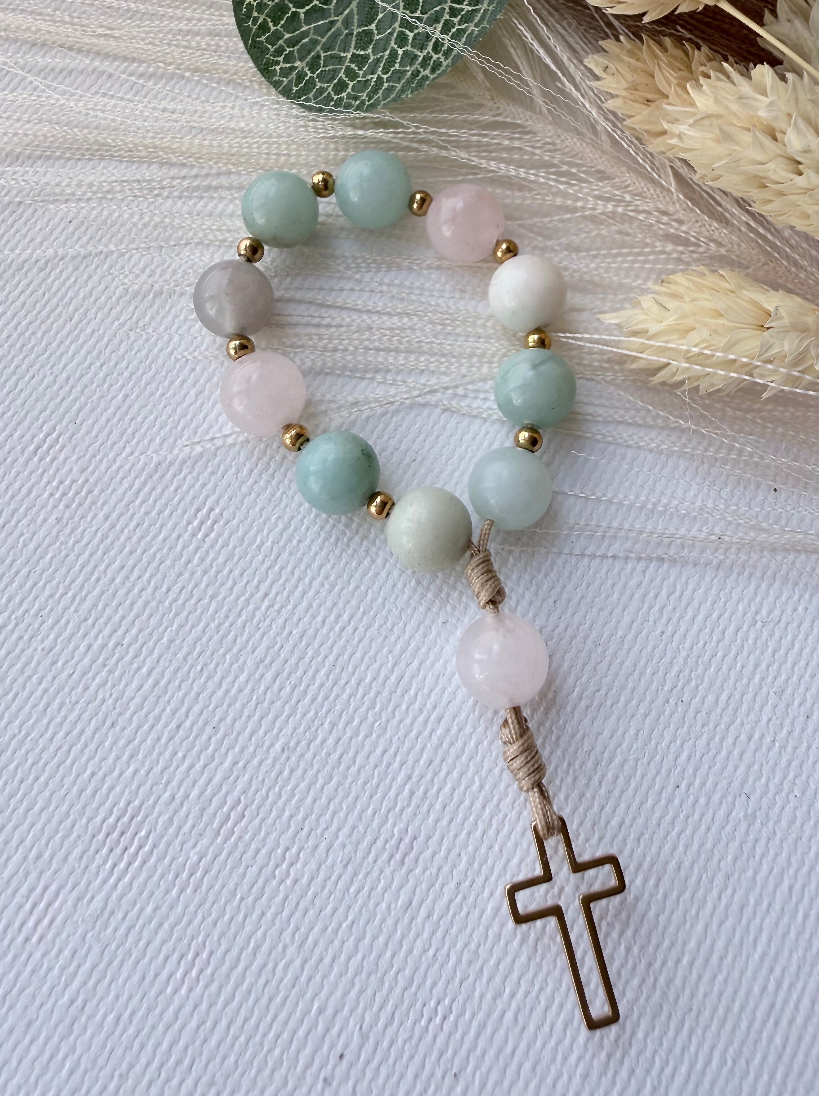 Miriam to hebrajskie imię Maryi – tej, która zaufała bez granic. W tej kieszonkowej dziesiątce różańca połączyłam agat lodowy, przypominający obłoki lub czysty szron, z delikatnością kwarcu różowego. Ten mały różaniec to przypomnienie o tym, że prawdziwa siła tkwi w delikatności i cichym "tak" powiedzianym Bogu. To zachęta do ufnej modlitwy w zgiełku dnia. Dzięki niewielkim rozmiarom możesz mieć go zawsze przy sobie, by w chwili stresu odnaleźć pokój serca.