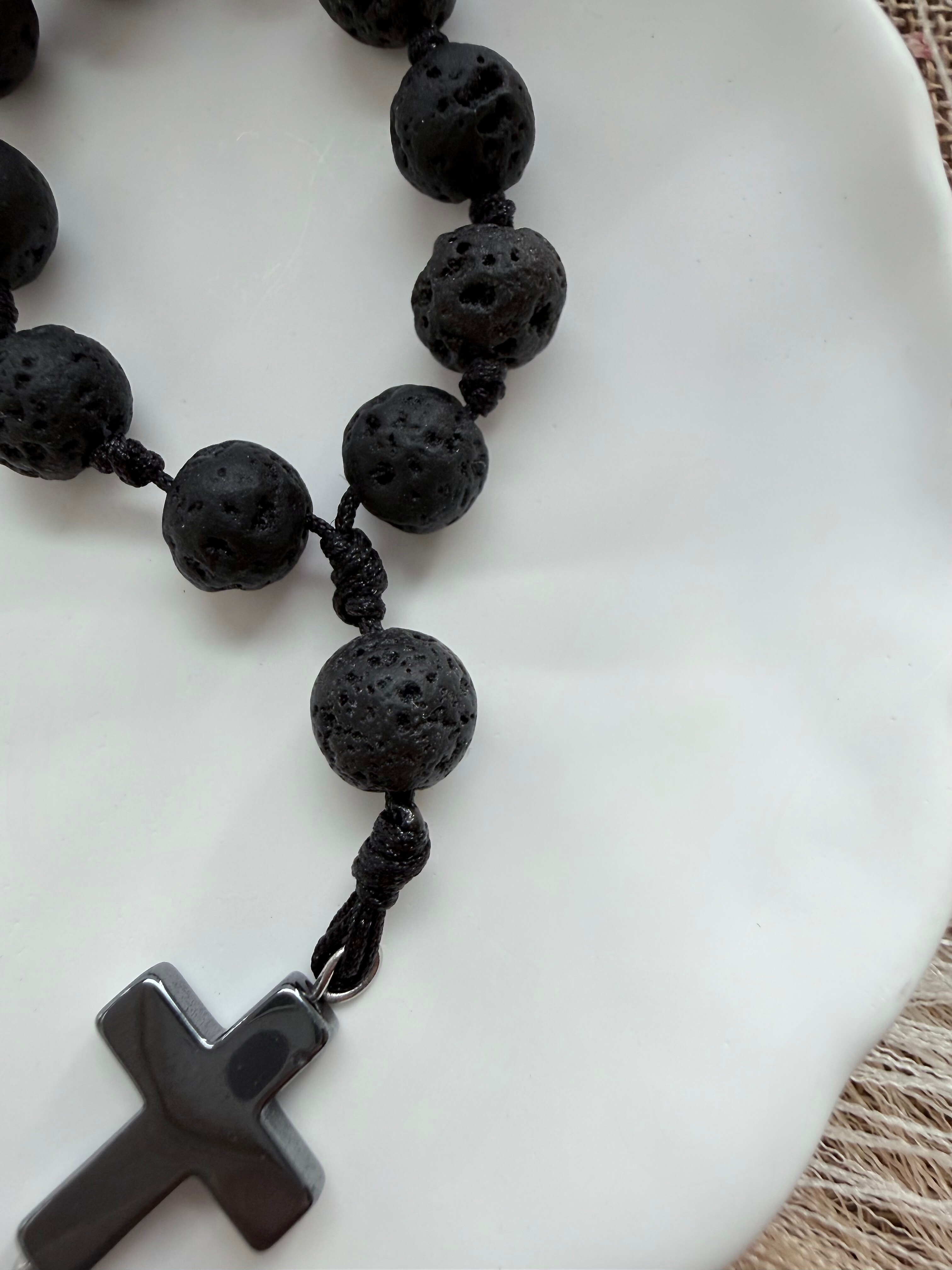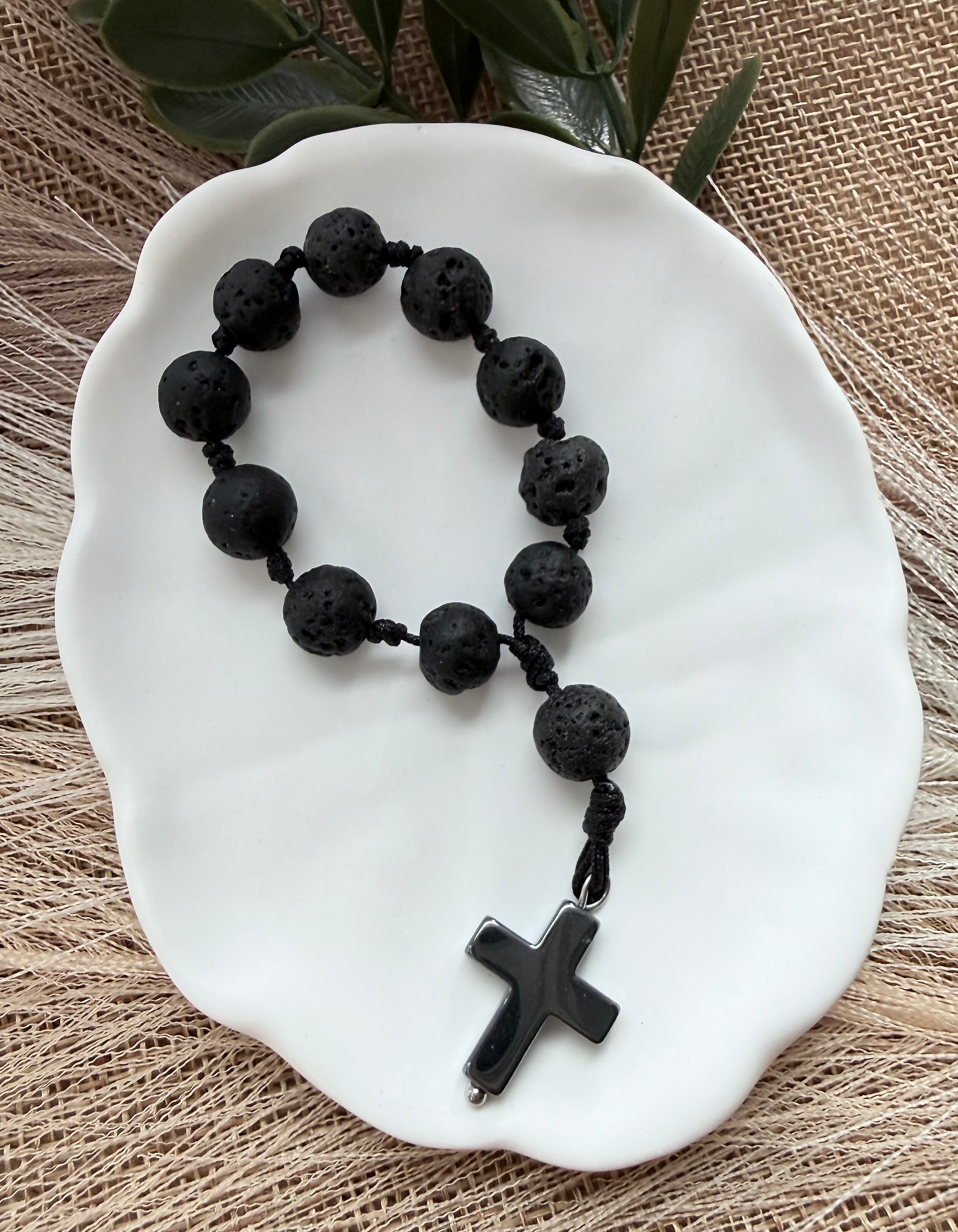 Czasem brakuje przestrzeni na długą modlitwę, ale potrzeba oparcia w Bogu pozostaje. Ta mała dziesiątka to kompaktowy odpowiednik dużego różańca "Ziemia Święta". Stworzona z surowej lawy wulkanicznej i metalicznego hematytu, jest dyskretnym, ale mocnym przypomnieniem o tym, kto jest Twoją Opoką. Idealna do tego, by chwycić ją w dłonie w drodze do pracy, w samochodzie czy w chwilach stresu, kierując krótkie "westchnienie" ku Niebu.