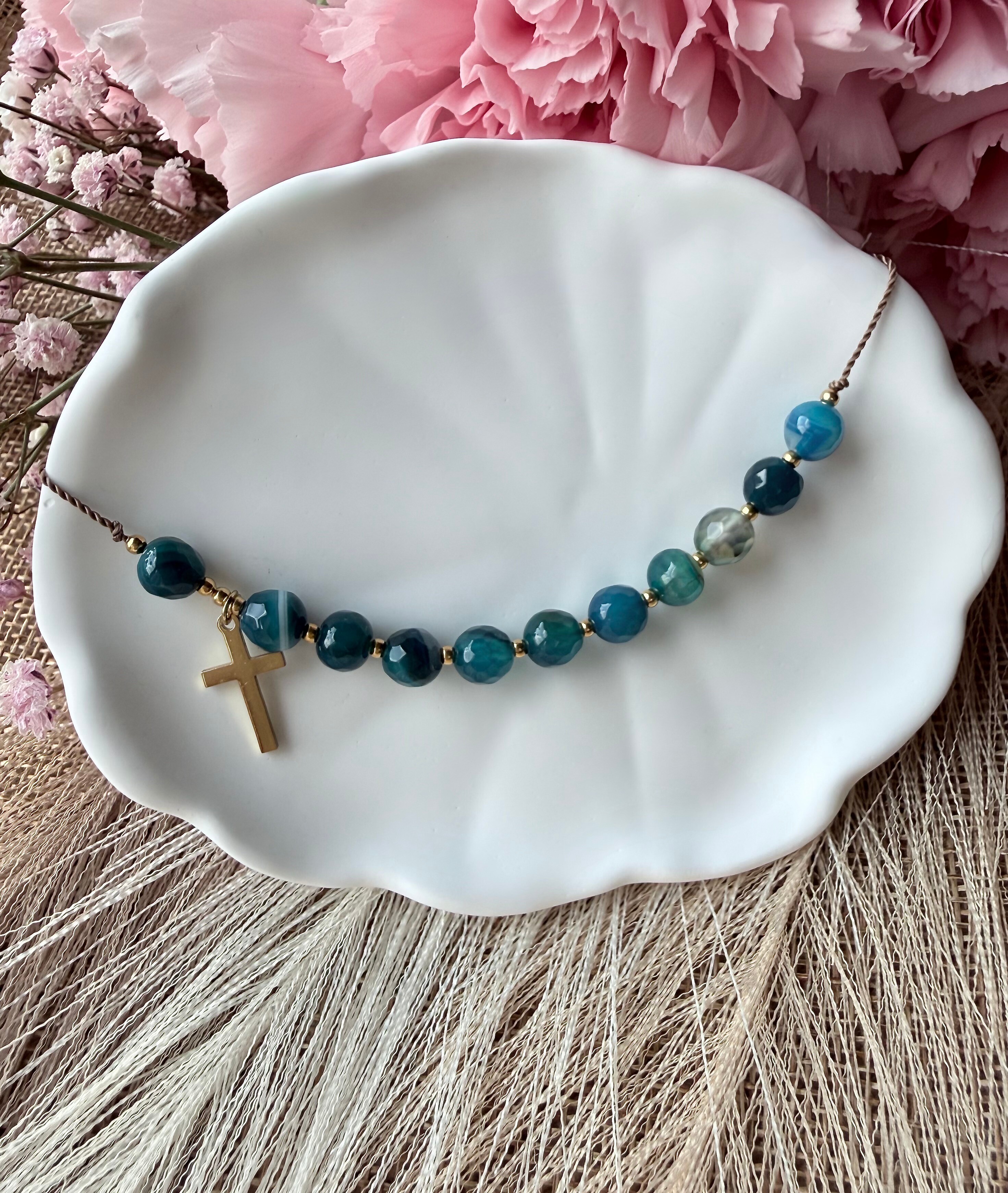 Jezioro Genezaret to świadek cudu uciszenia burzy. Ten różaniec na rękę powstał po to, by w trudnych momentach dnia przypominać Ci słowa Jezusa: "Nie bój się, tylko wierz". Głęboki błękit agatu przywołuje obraz biblijnych wód. Przesuwając koraliki, możesz w każdej chwili "wsiąść do łodzi" z Jezusem i oddać Mu swoje lęki. To dyskretna pomoc w trwaniu przy Bogu, który jest Panem każdego żywiołu.