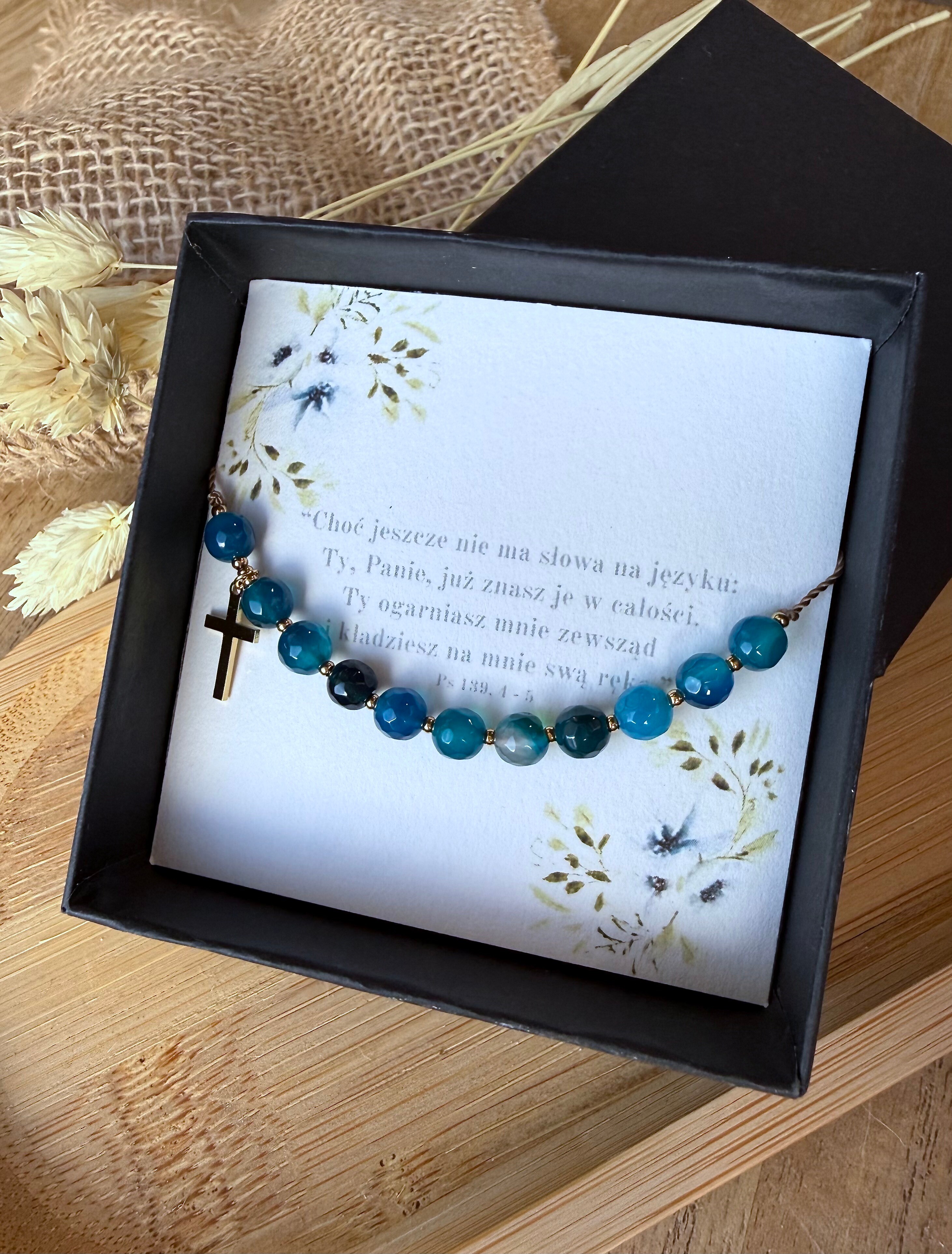 Bransoletka jest starannie zapakowana w estetyczne pudełeczko, gotowe do wręczenia. Wewnątrz pudełka znajdziesz karteczkę z dedykowanym cytatem z Pisma Świętego.