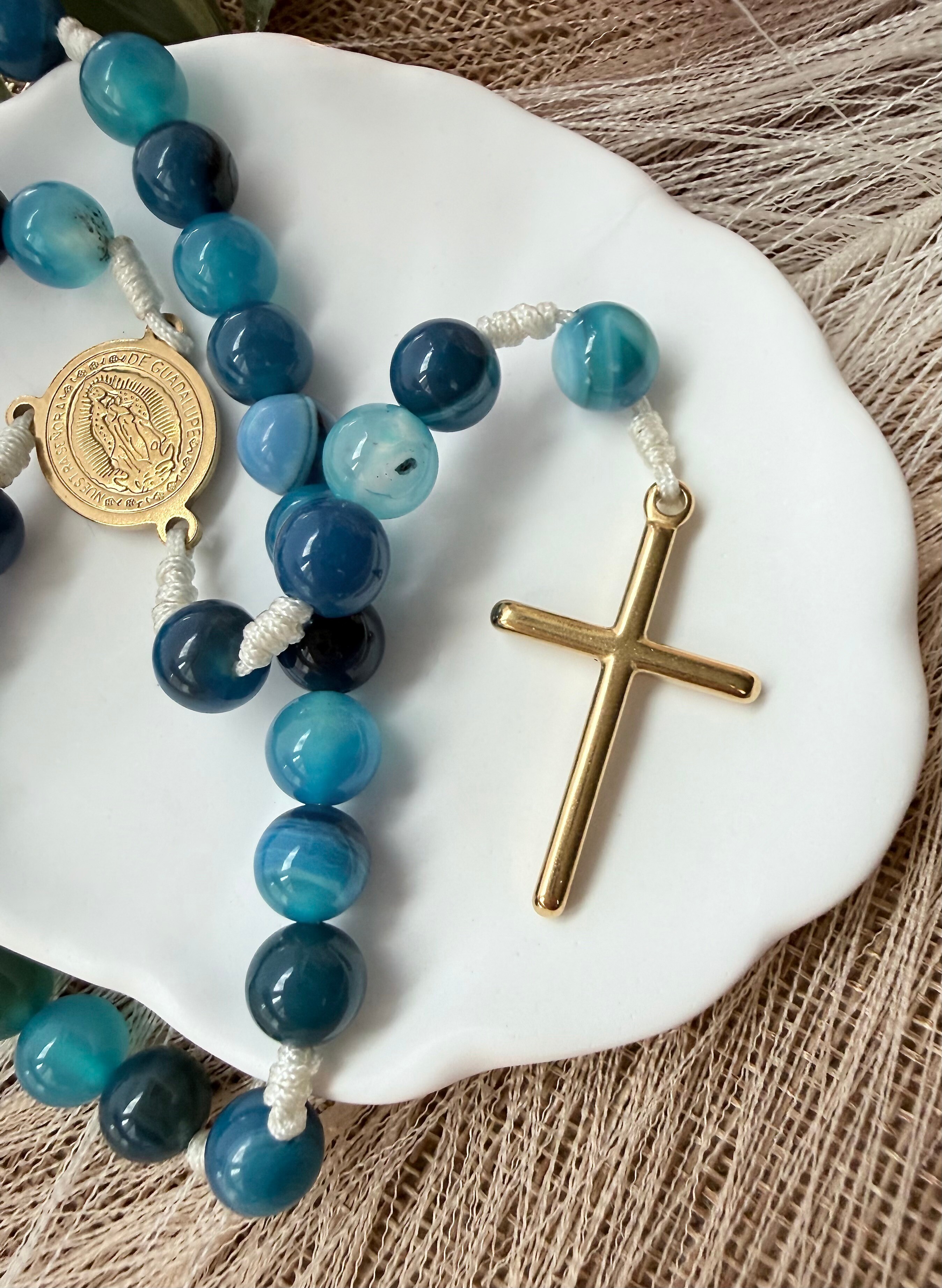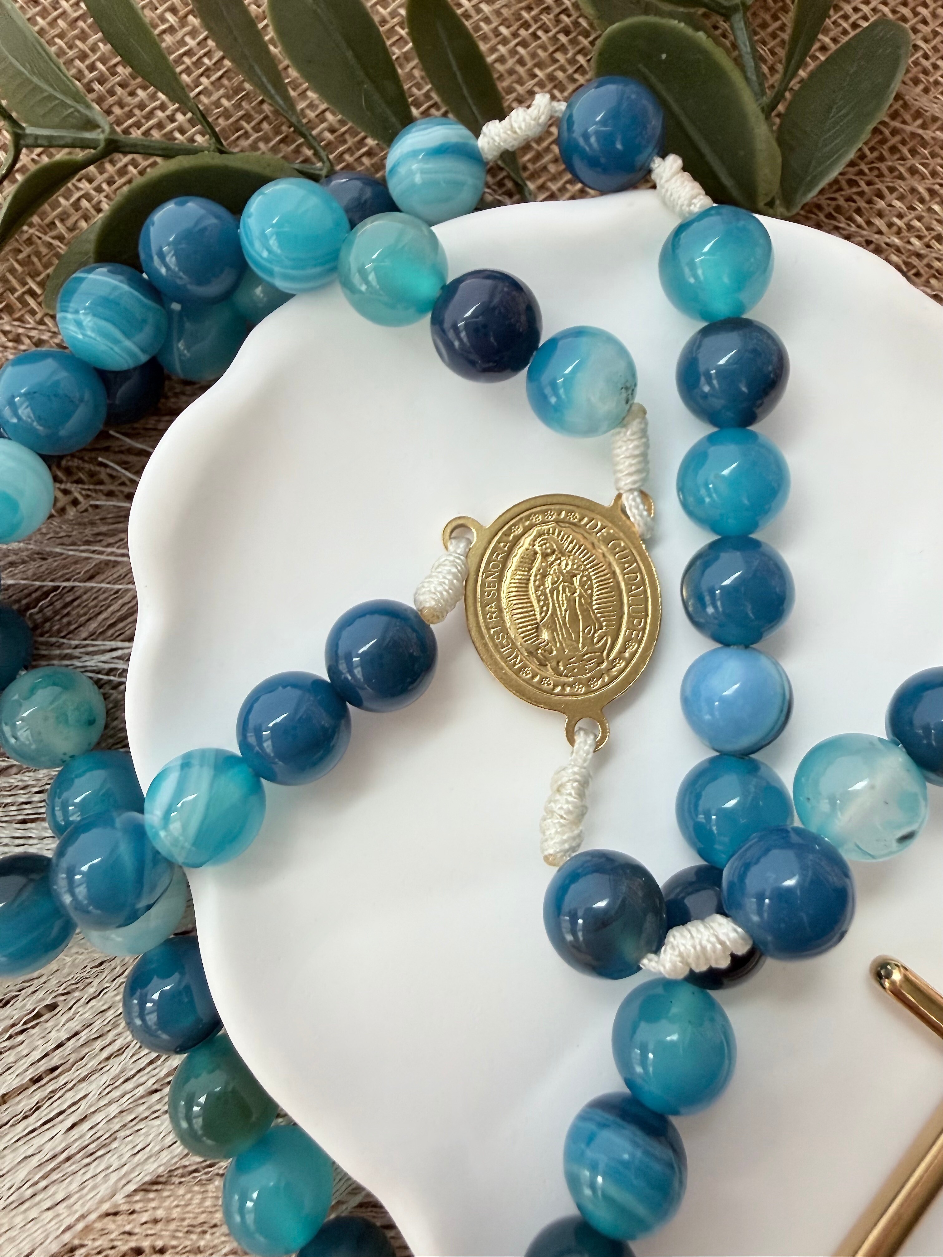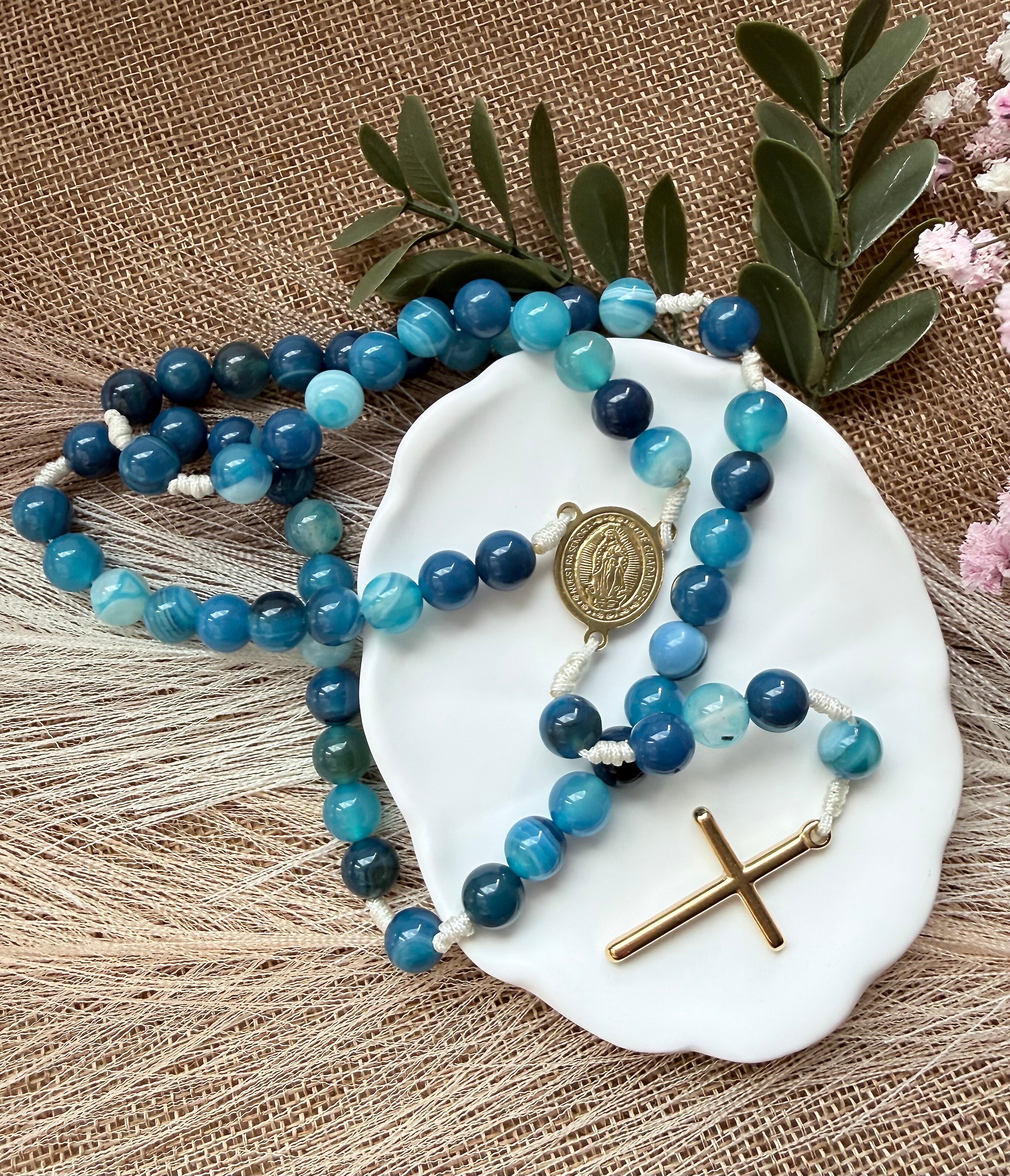 Kamienie (ok. 8 mm): Naturalny agat niebieski w przepięknych, kojących odcieniach błękitu. Większe koraliki przyjemnie i pewnie układają się w dłoni podczas modlitwy.