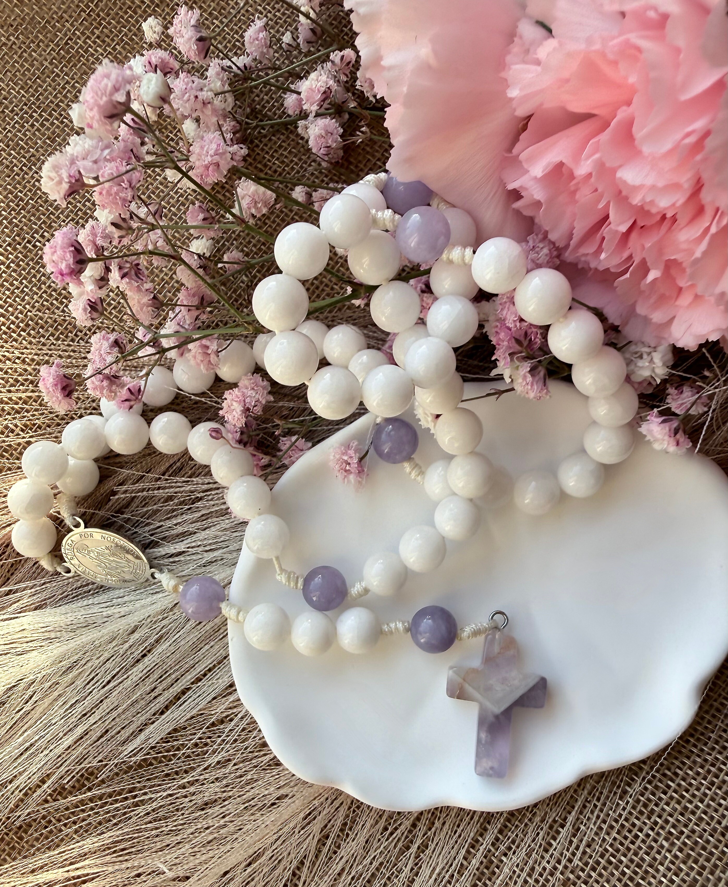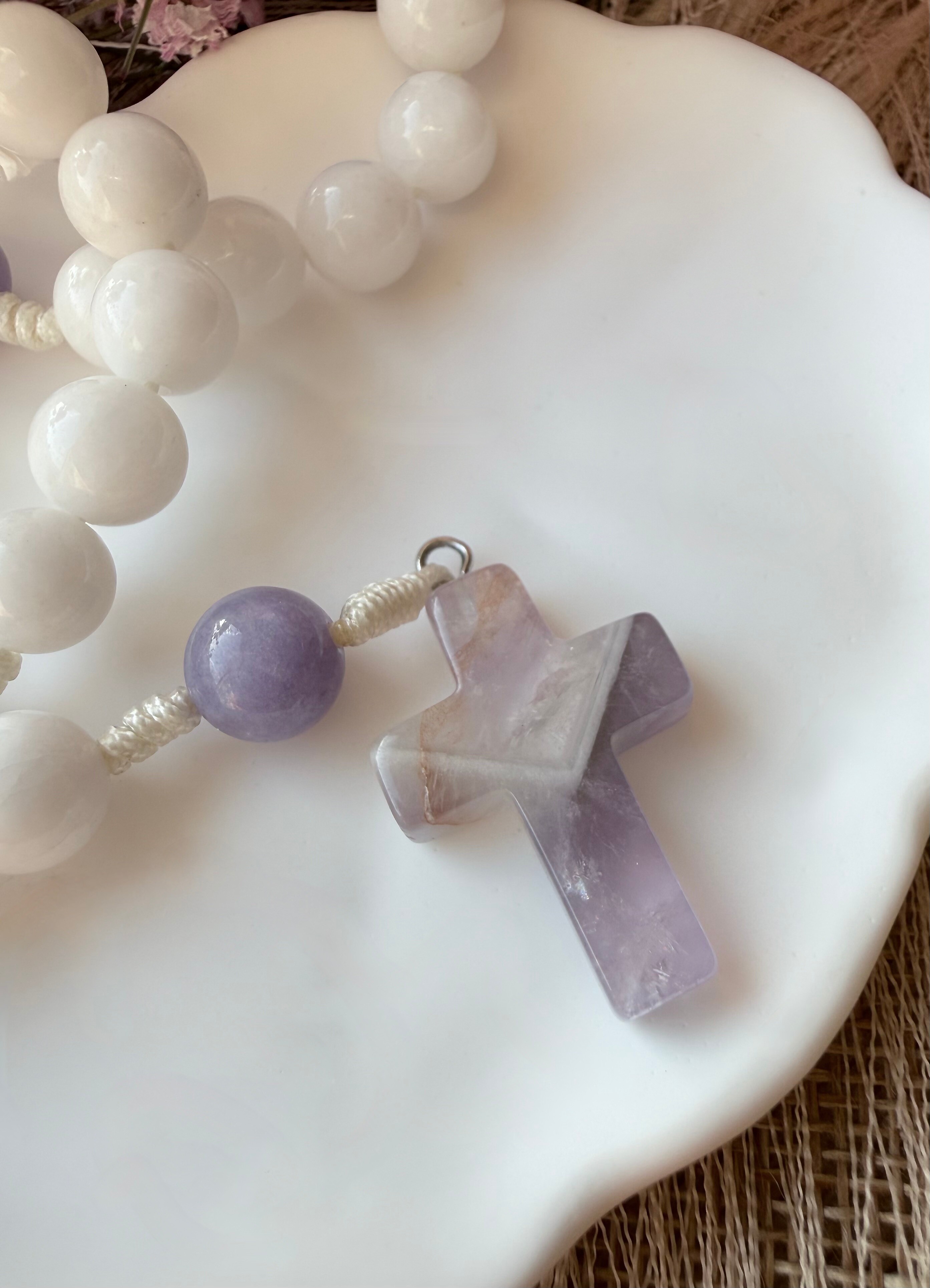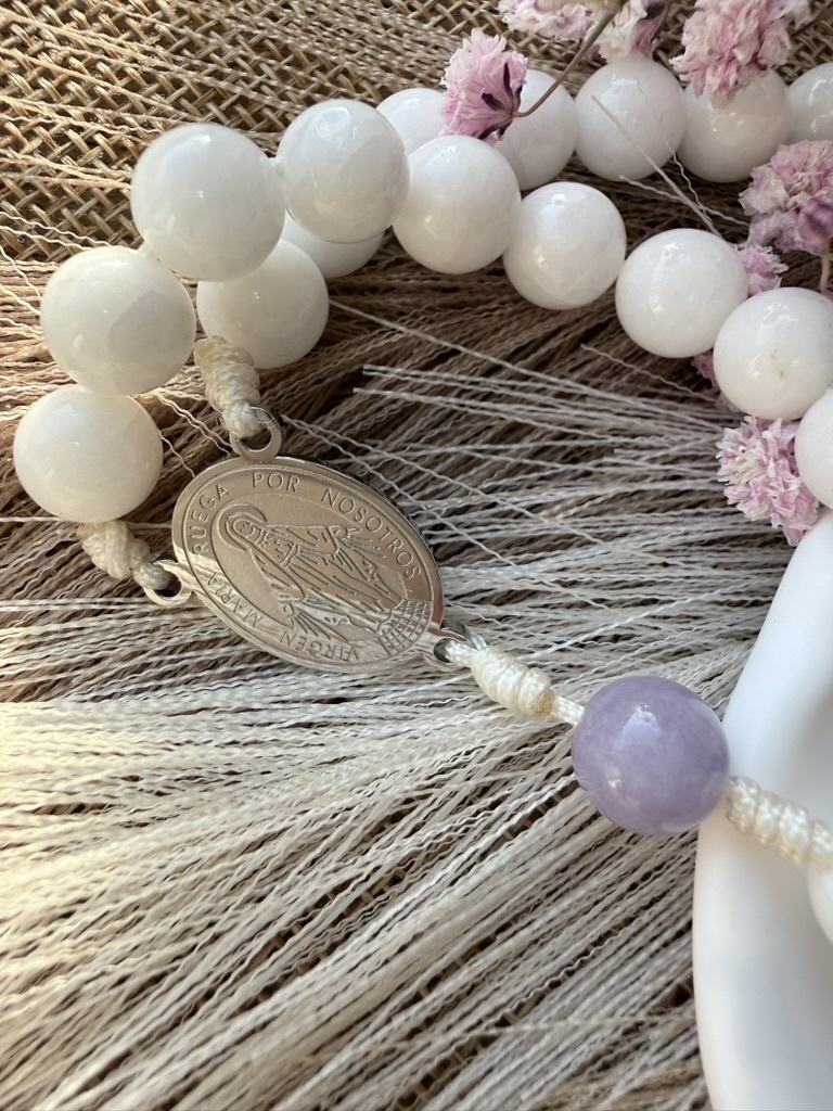 "Magnificat" to najpiękniejsza biblijna pieśń radości, wdzięczności i spełnionych obietnic. Ten pełny, klasyczny różaniec został stworzony po to, by towarzyszyć Ci w dziękczynieniu za każdą łaskę. Jego kolorystyka kryje w sobie głęboką symbolikę, łącząc dwa wymiary Maryi. Rzadki, liliowy anhydryt (zwany "kamieniem anielskim") reprezentuje królewską godność i łagodność, podczas gdy mleczny biały agat to symbol czystości i pokornej Służebnicy. Wyjątkowym zwieńczeniem tej kompozycji jest kamienny krzyż z głębokiego ametystu, który wspaniale podkreśla duchowy charakter modlitwy. To narzędzie dla kobiety, która pragnie z ufnością i elegancją wielbić Boga w każdej chwili swojego życia.