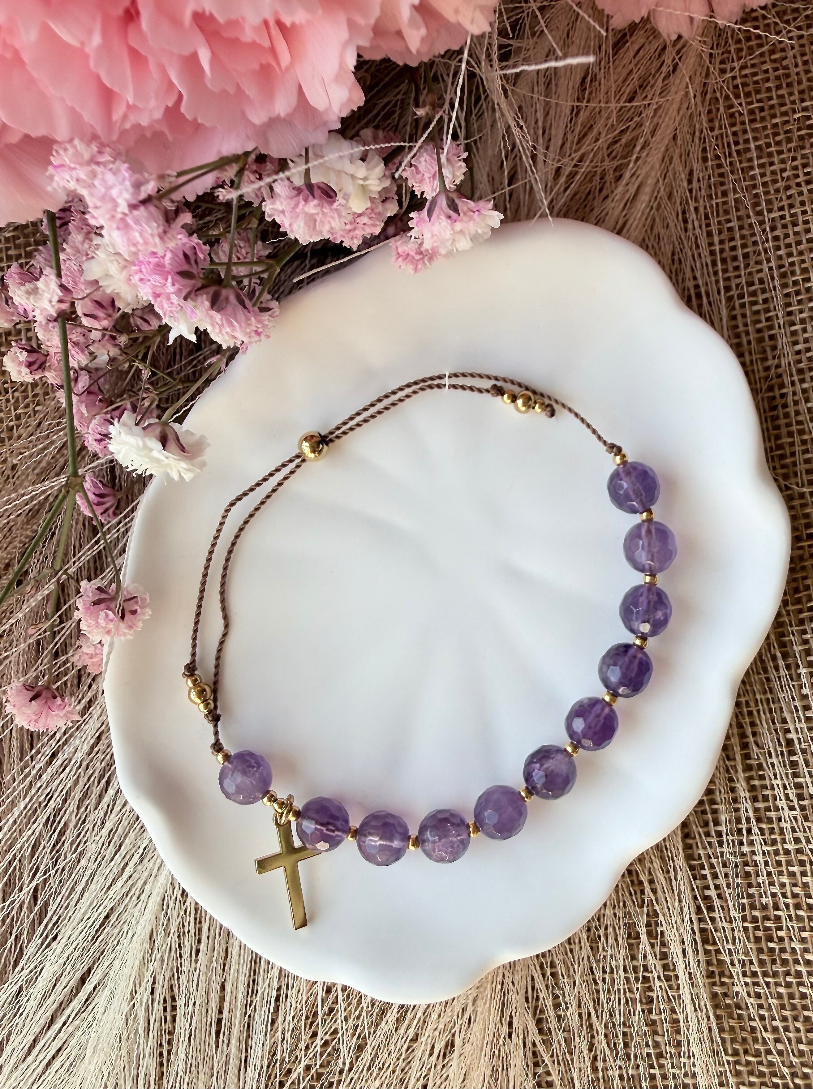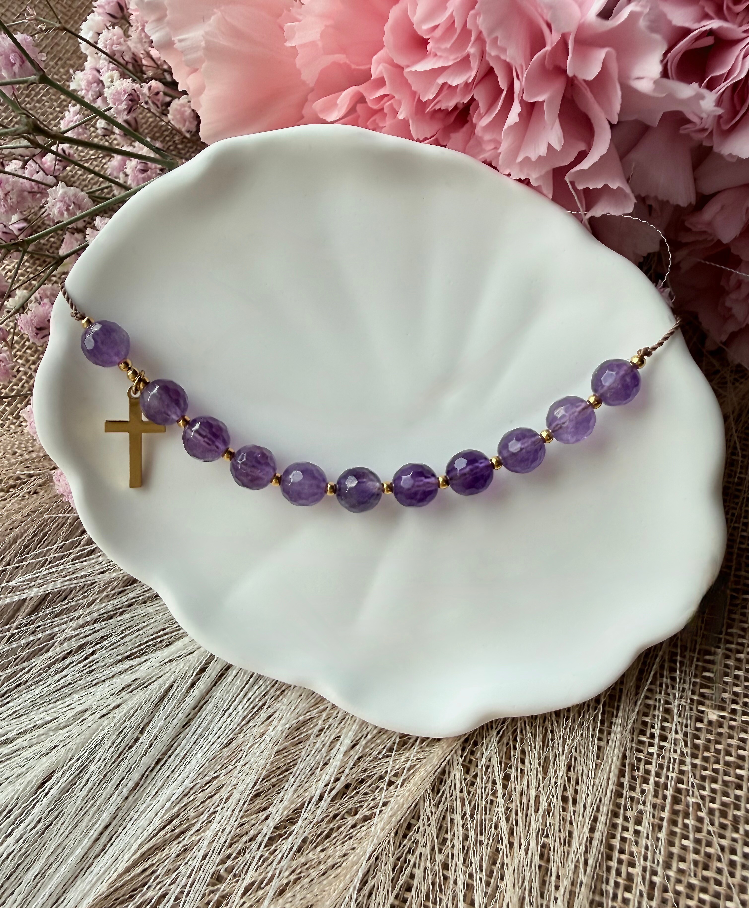 Naturalny ametyst (ok. 6,5 mm) – kamień o szlachetnej, fioletowej barwie, symbolizującej duchową głębię i godność Dziecka Bożego.