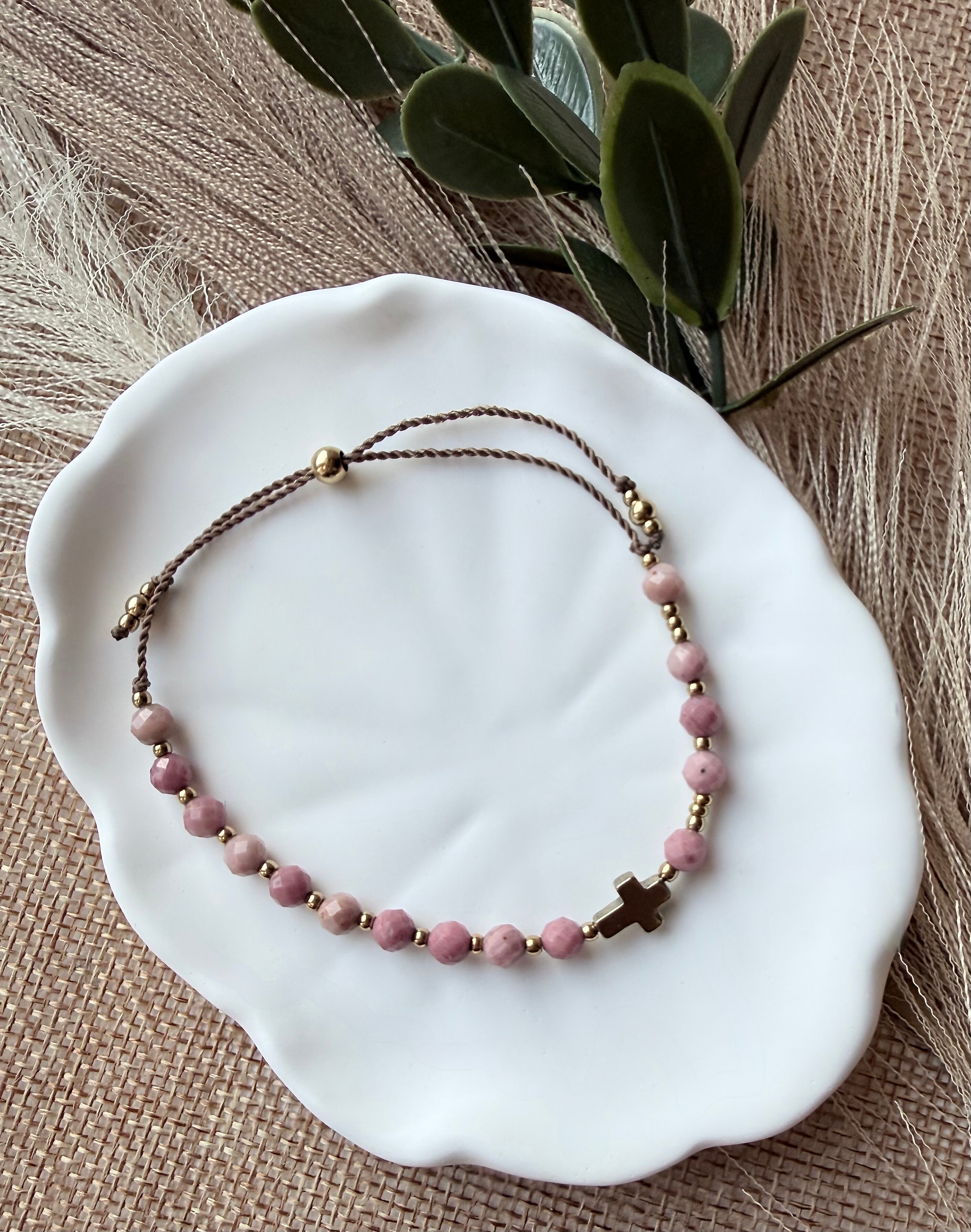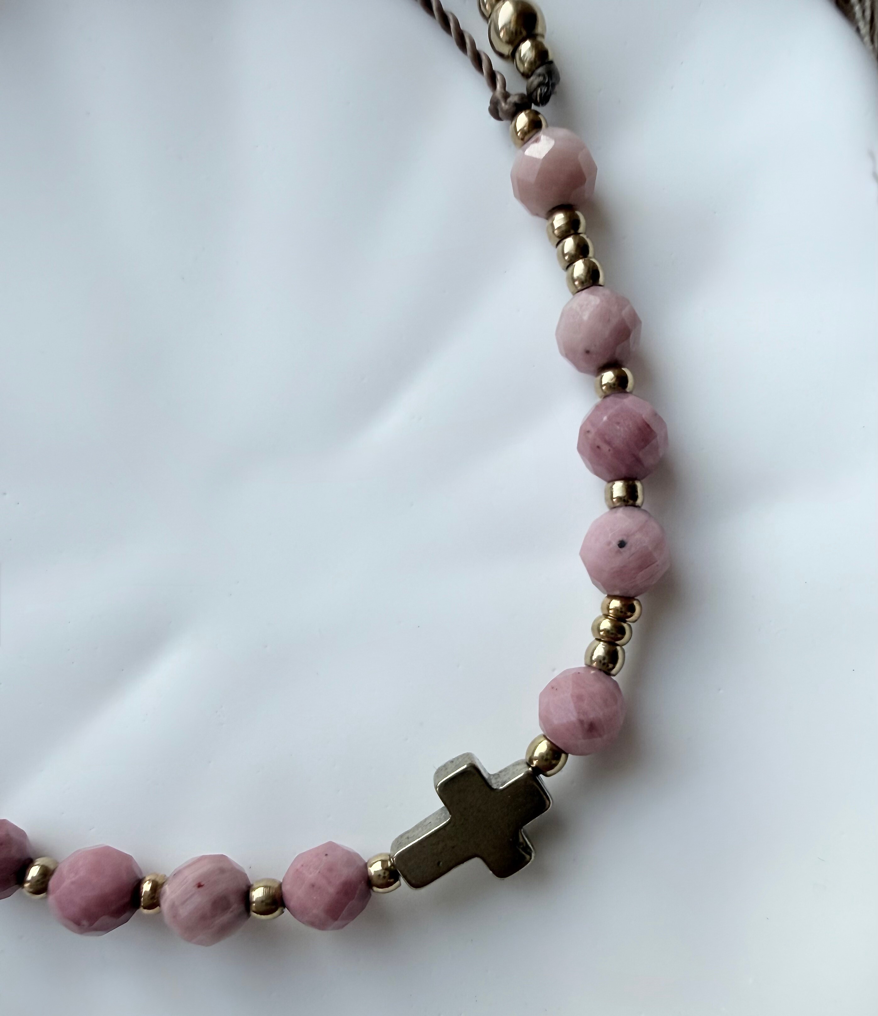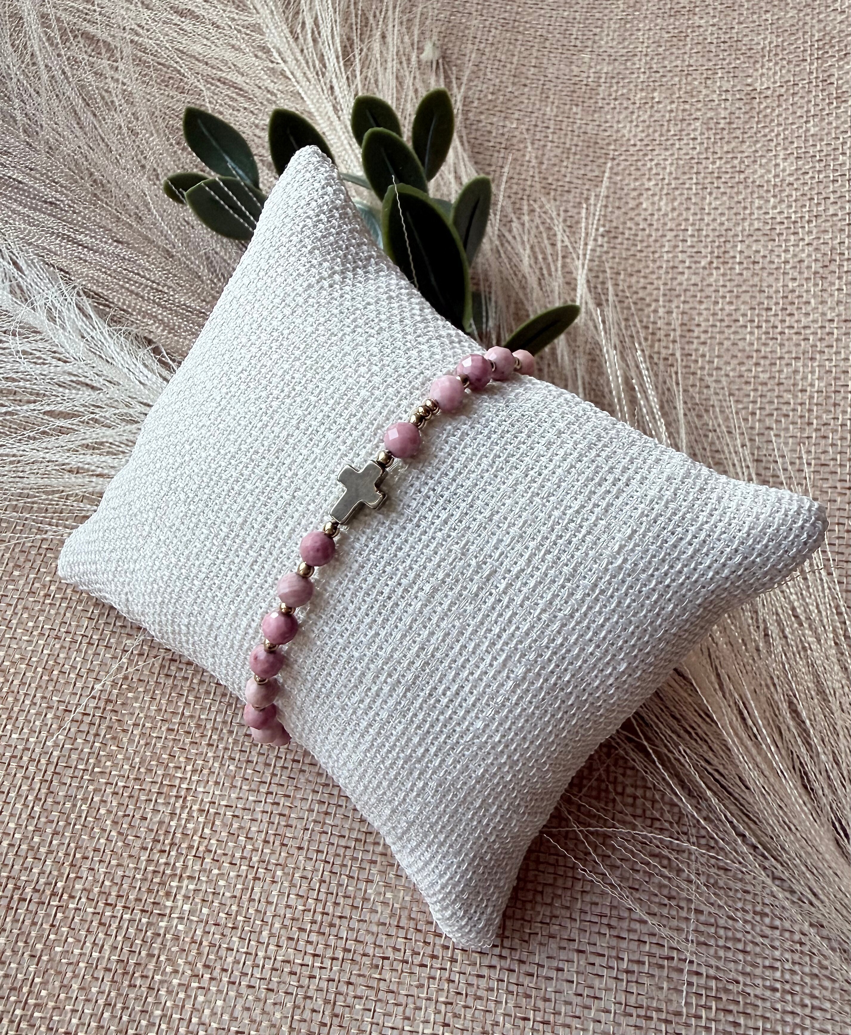 Model "Odwaga Miłości" powstał jako uzupełnienie Twojej ulubionej kolekcji (pasuje idealnie do różańca "Dzielna Niewiasta", kolczyków "Maria Magdalena" czy do naszyjnika "Umiłowana"). Rodonit to kamień niezwykły – jego barwa to głęboki, zgaszony róż, często przełamany ciemniejszymi pasmami. Symbolizuje miłość dojrzałą, która nie boi się trudności. To bransoletka dla kobiety, która wie, że prawdziwe uczucie wymaga czasem odwagi i wybaczenia. Przypomina, by w codziennym zabieganiu nie tracić z oczu tego, co najważniejsze – relacji z Bogiem i ludźmi.