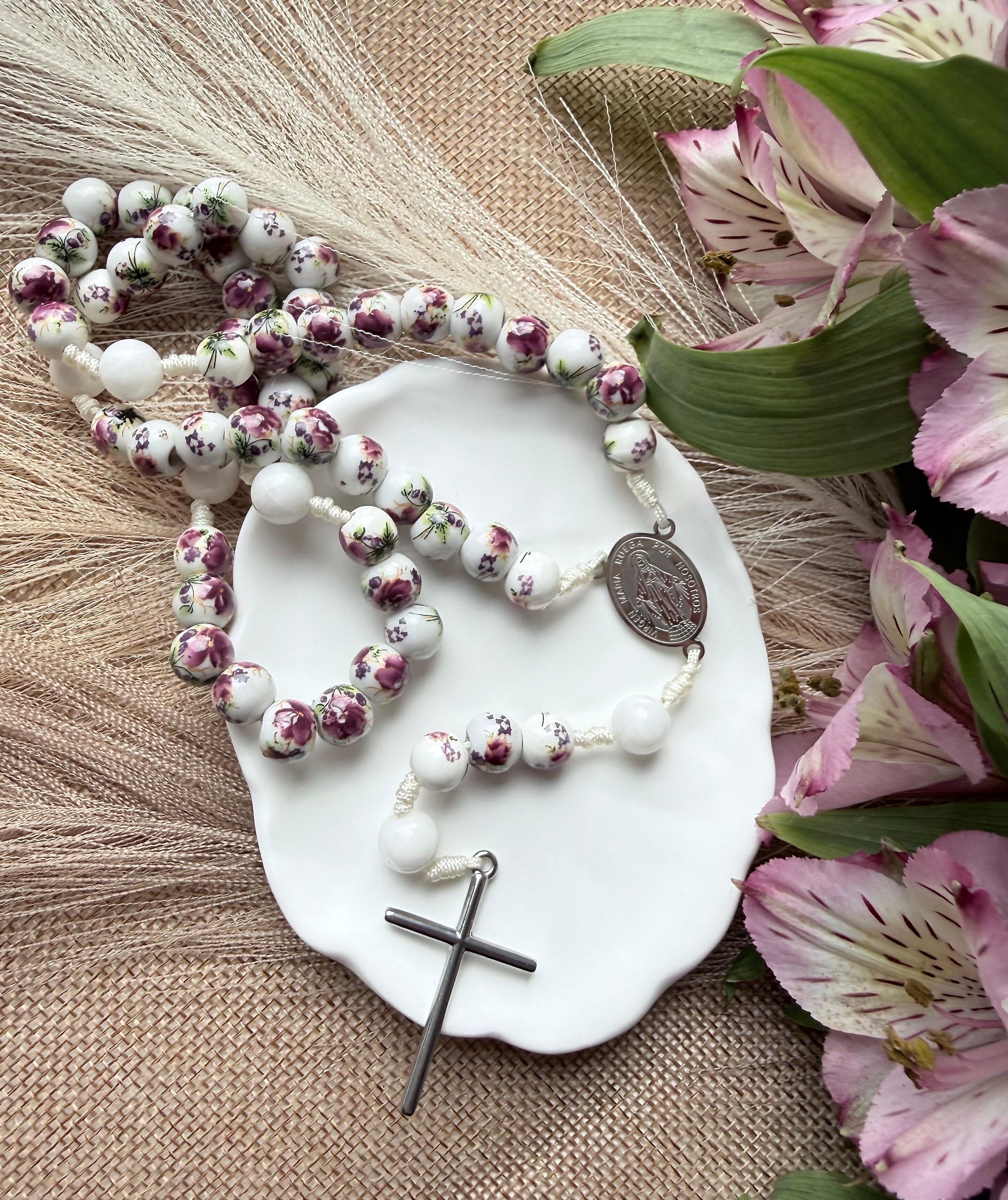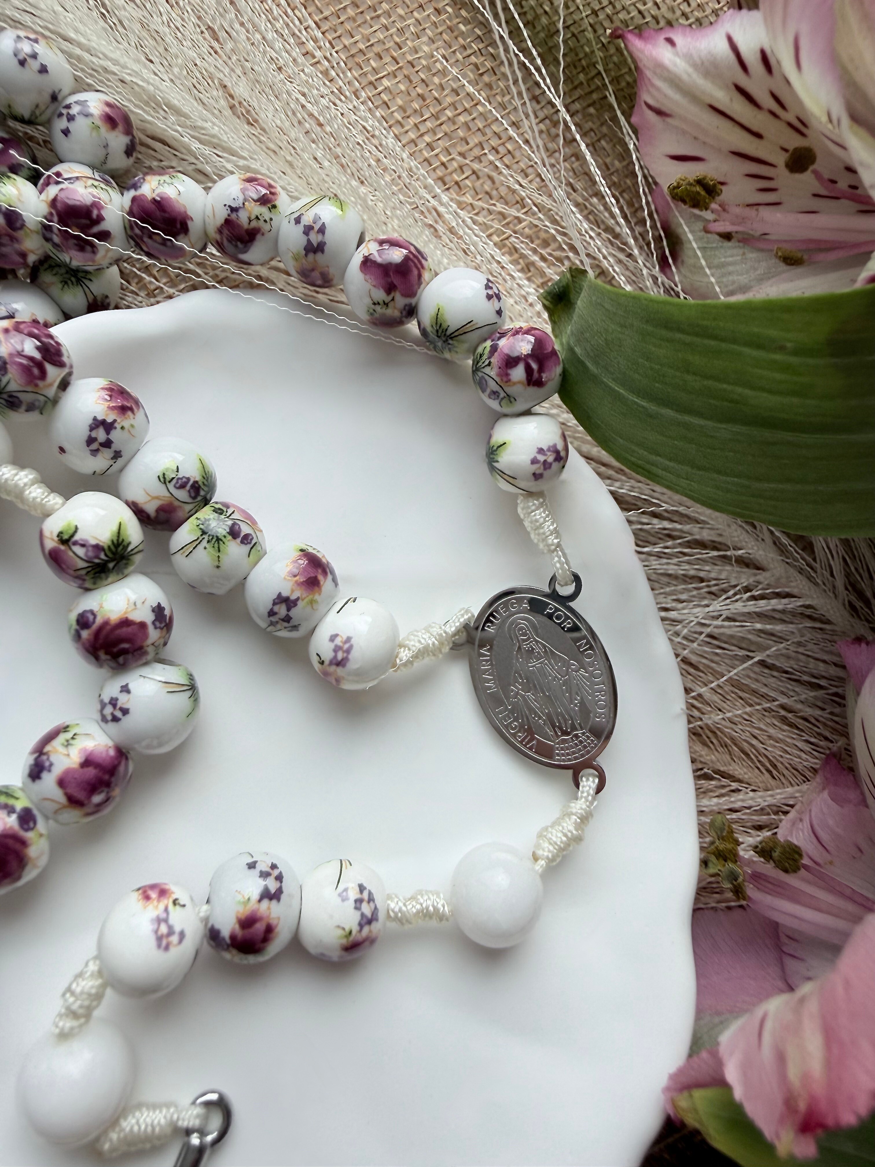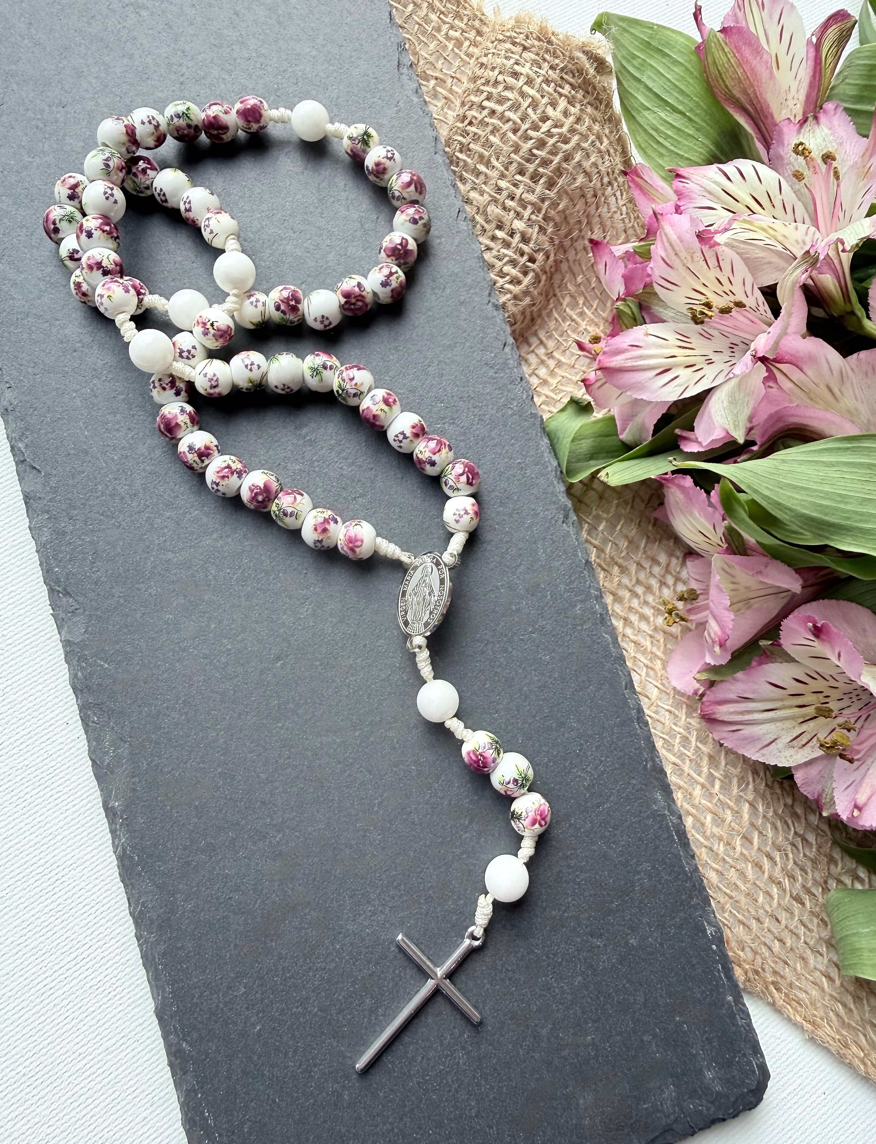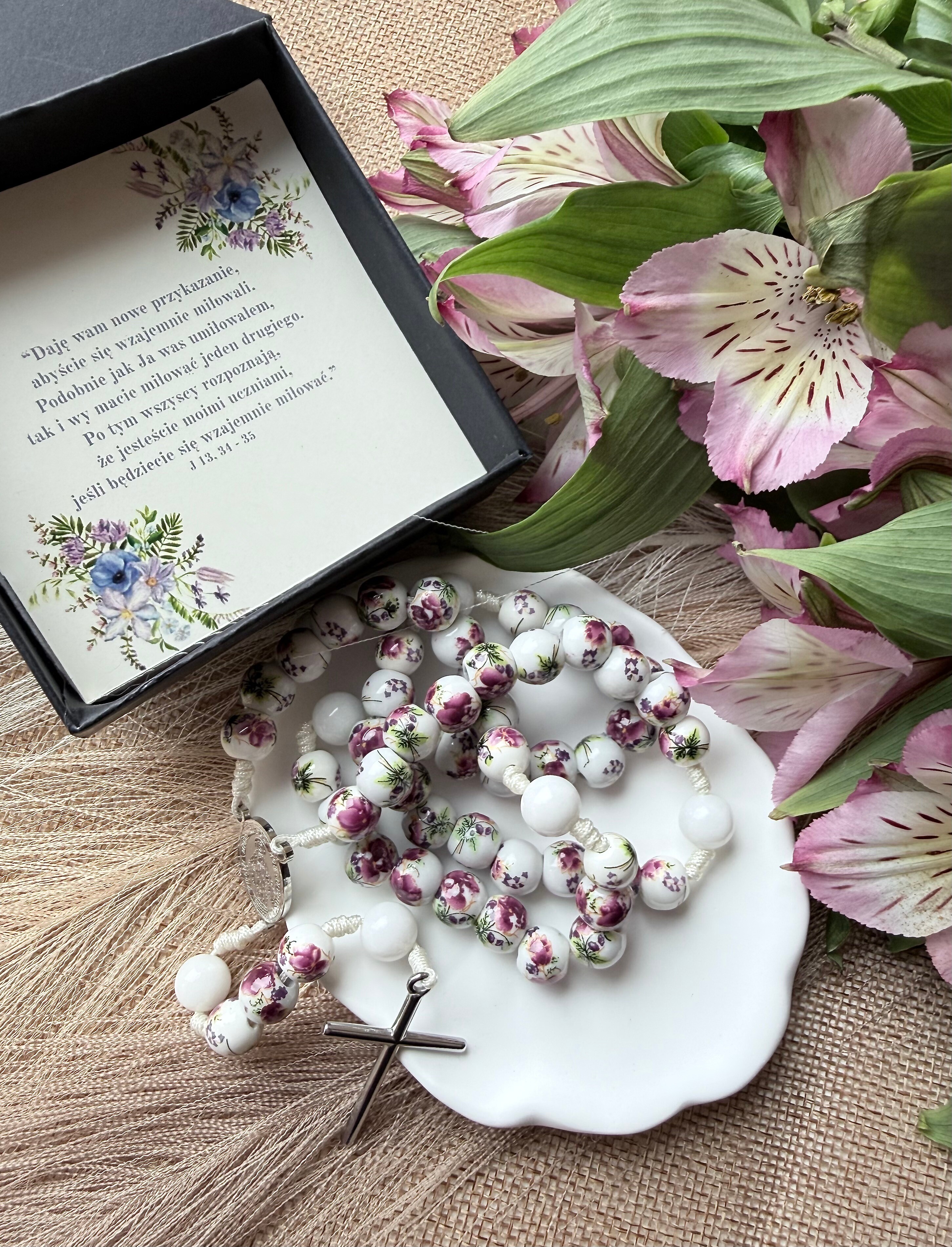 Róża i piwonia to królowe kwiatów. Od wieków Maryja nazywana jest "Rosa Mystica" – Różą Duchowną. Model "Ogród Różany" to hołd dla Jej piękna. Porcelanowe koraliki zdobione motywem różowych kwiatów (piwonii/róż) przeplatają się z mlecznym białym agatem, tworząc całość niezwykle romantyczną i kobiecą. Srebrne elementy podkreślają szlachetność tej kompozycji.