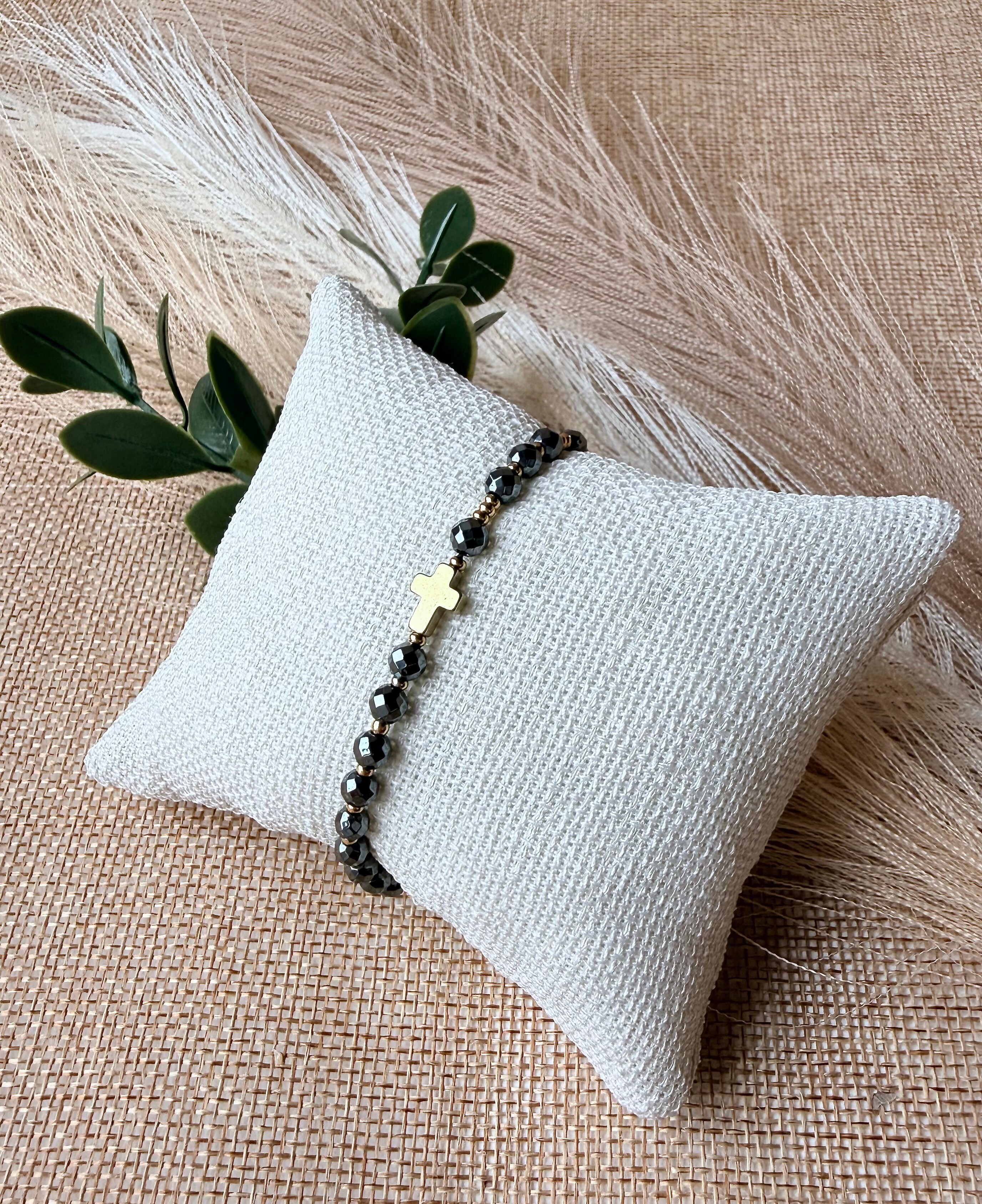 Krzyżyk ze złotego hematytu tworzy razem spójną, minimalistyczną formę.