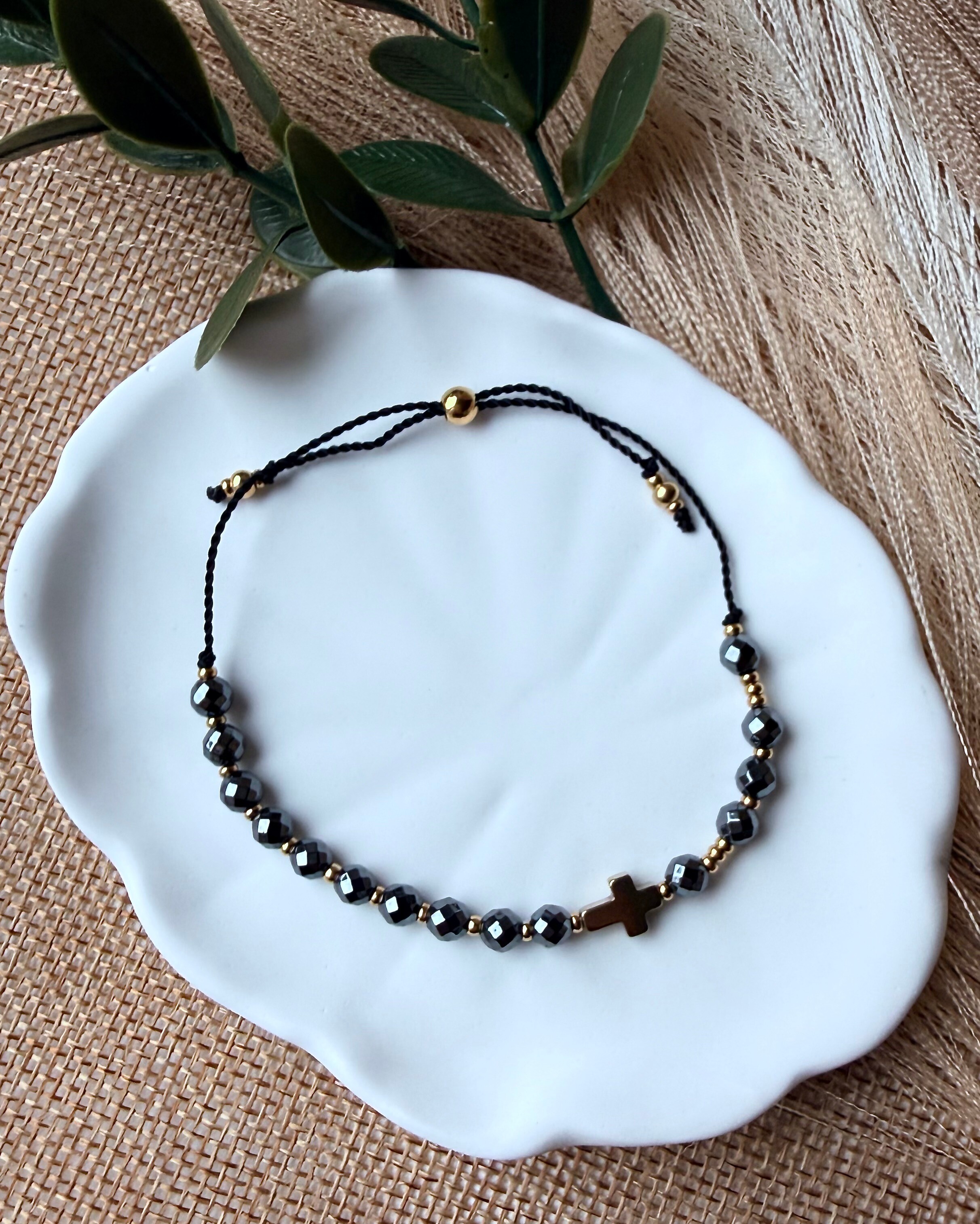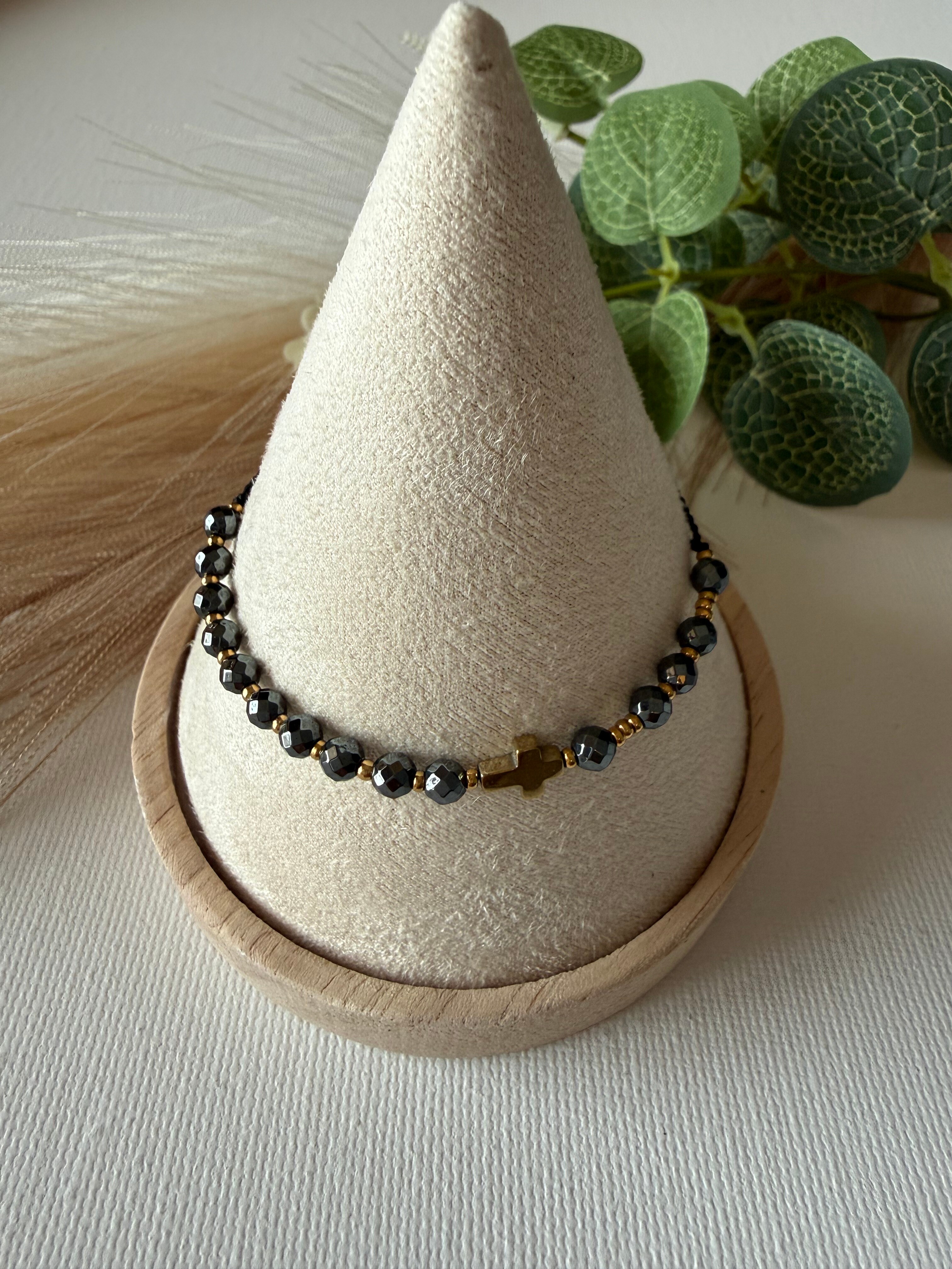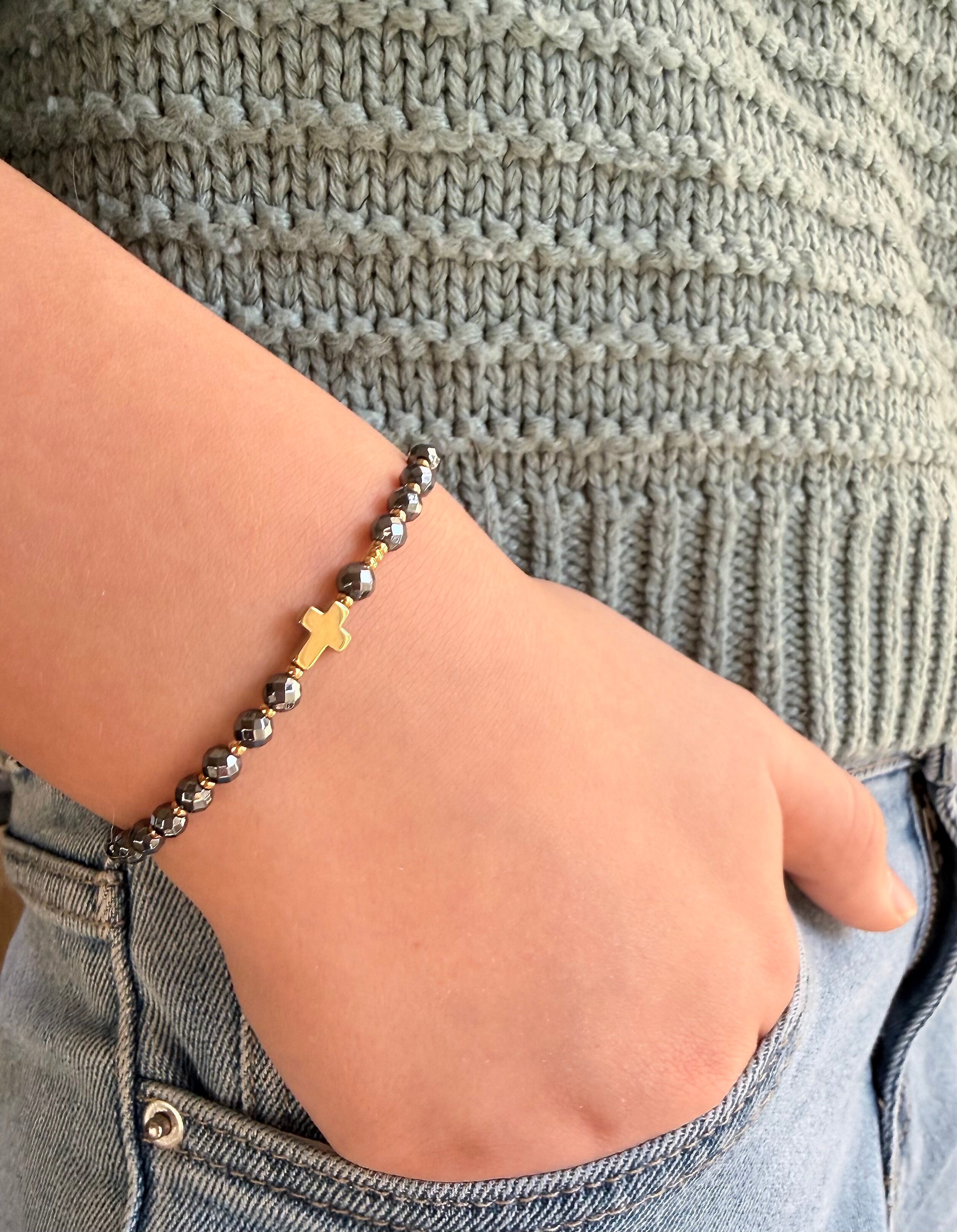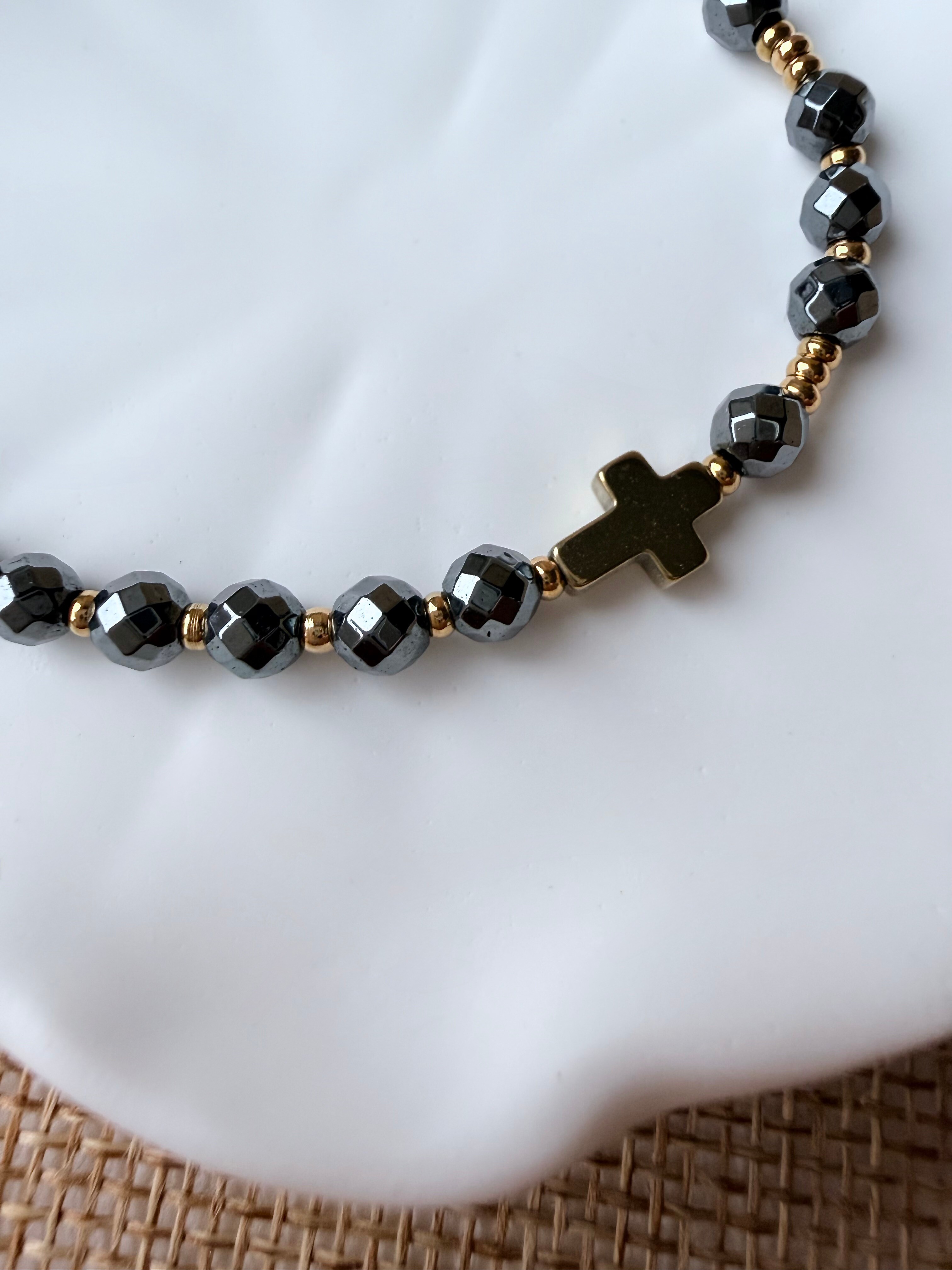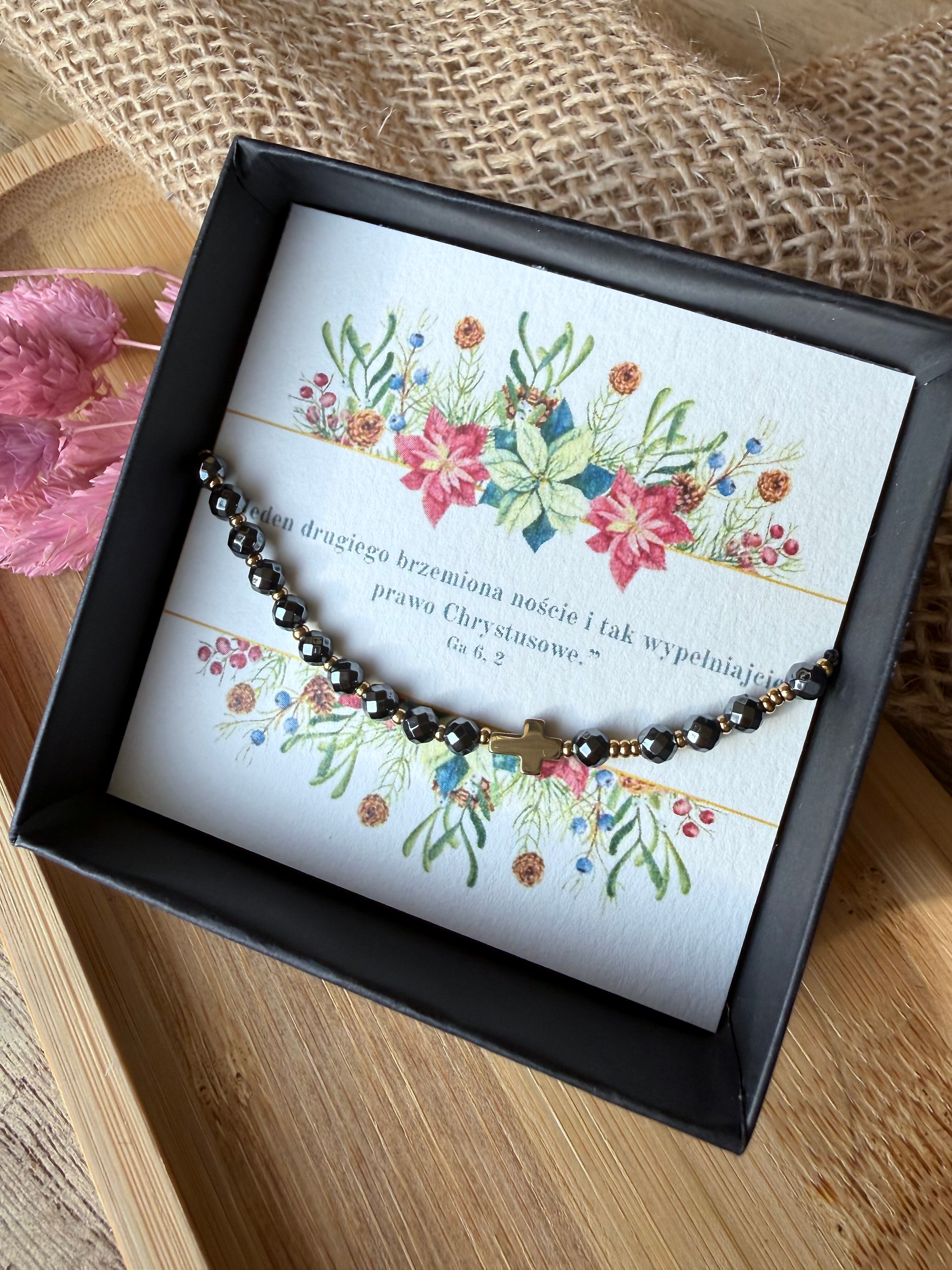 Model "Siła Wiary" stworzyłam z myślą o chwilach, gdy potrzebujesz czuć się bezpiecznie i pewnie. Wybrałam do niego hematyt – kamień o niezwykłej twardości i pięknym, metalicznym blasku. W Biblii czytamy o "przywdzianiu Zbroi Bożej", a hematyt jest właśnie jak taka zbroja. Jest chłodny w dotyku, solidny i daje przyjemne poczucie "uziemienia". Nosząc go, przypominasz sobie, że Twoja siła nie pochodzi z Ciebie, ale od Tego, który jest Wszechmogący.