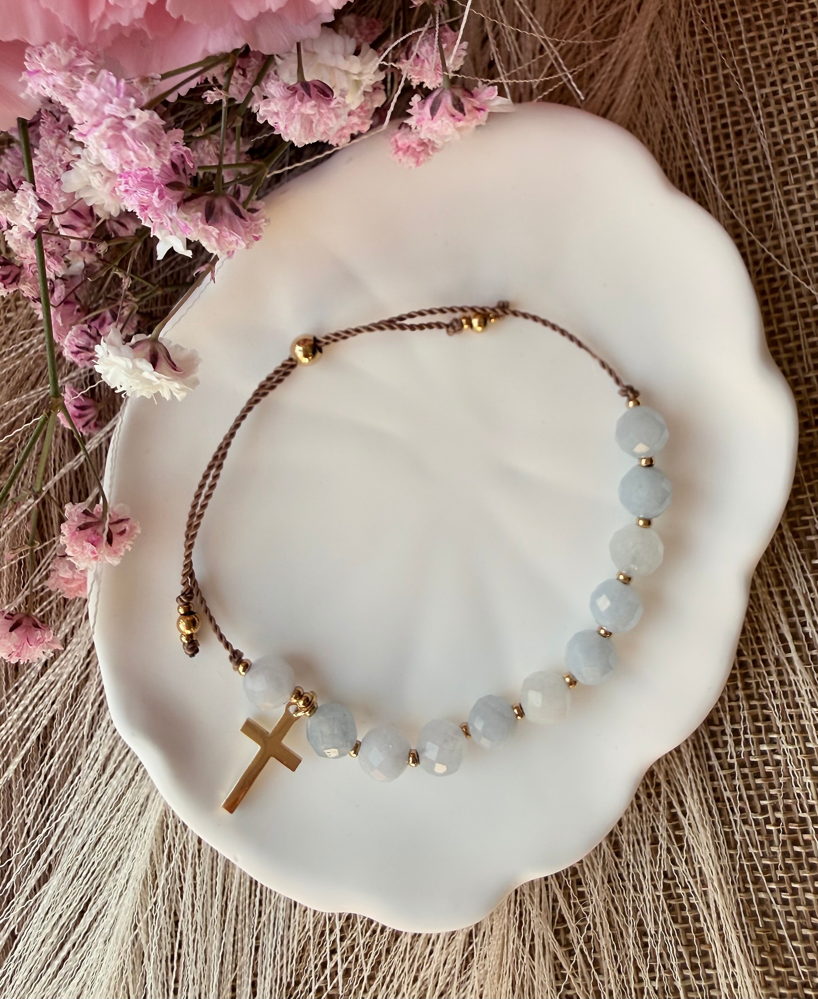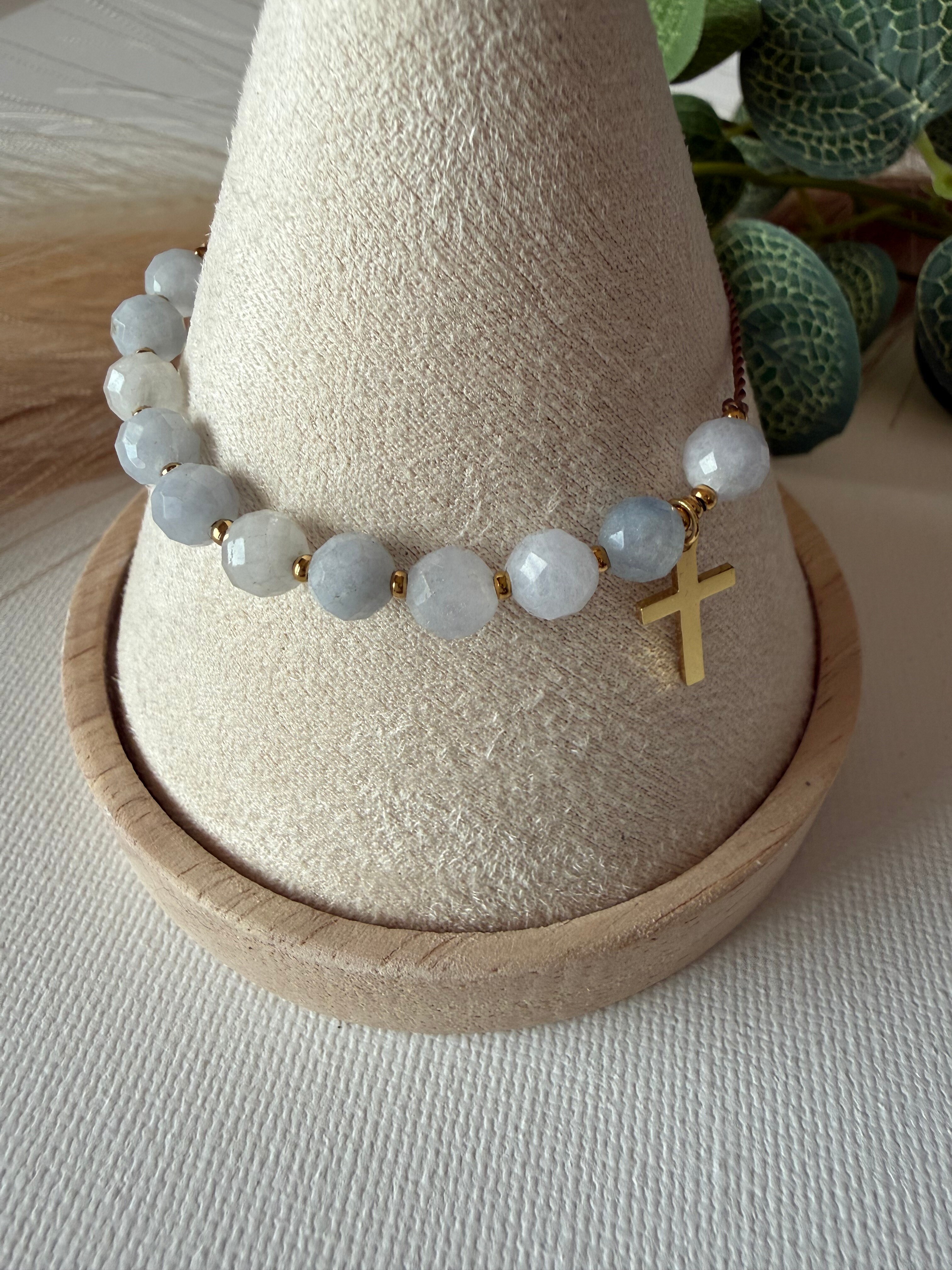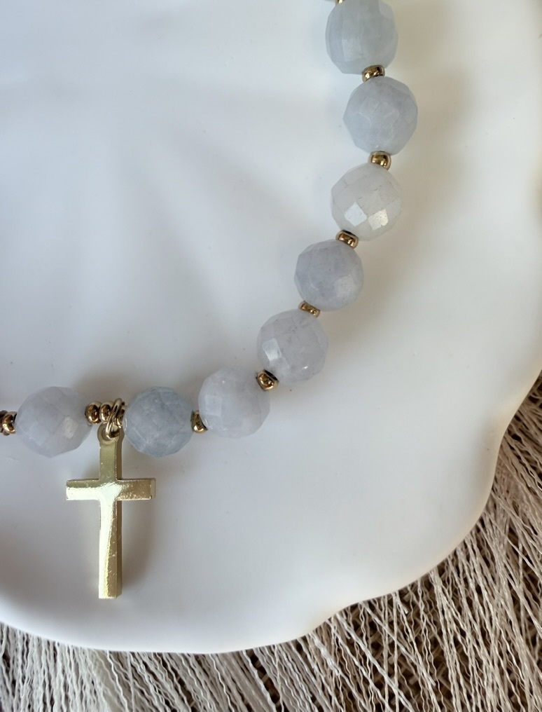 Jordan to rzeka przemiany – to tam niebo otworzyło się nad Jezusem. Ten różaniec na rękę jest subtelnym przypomnieniem o Twoim Chrzcie i o tym, że każdego dnia możesz zacząć od nowa, obmyta z wczorajszych trosk. Krystaliczny błękit akwamarynu przywodzi na myśl czystą wodę. Przesuwając te jasne koraliki w modlitwie, zanurzasz swoje myśli w Bożym Miłosierdziu, odnajdując świeżość i pokój, którego świat dać nie może.