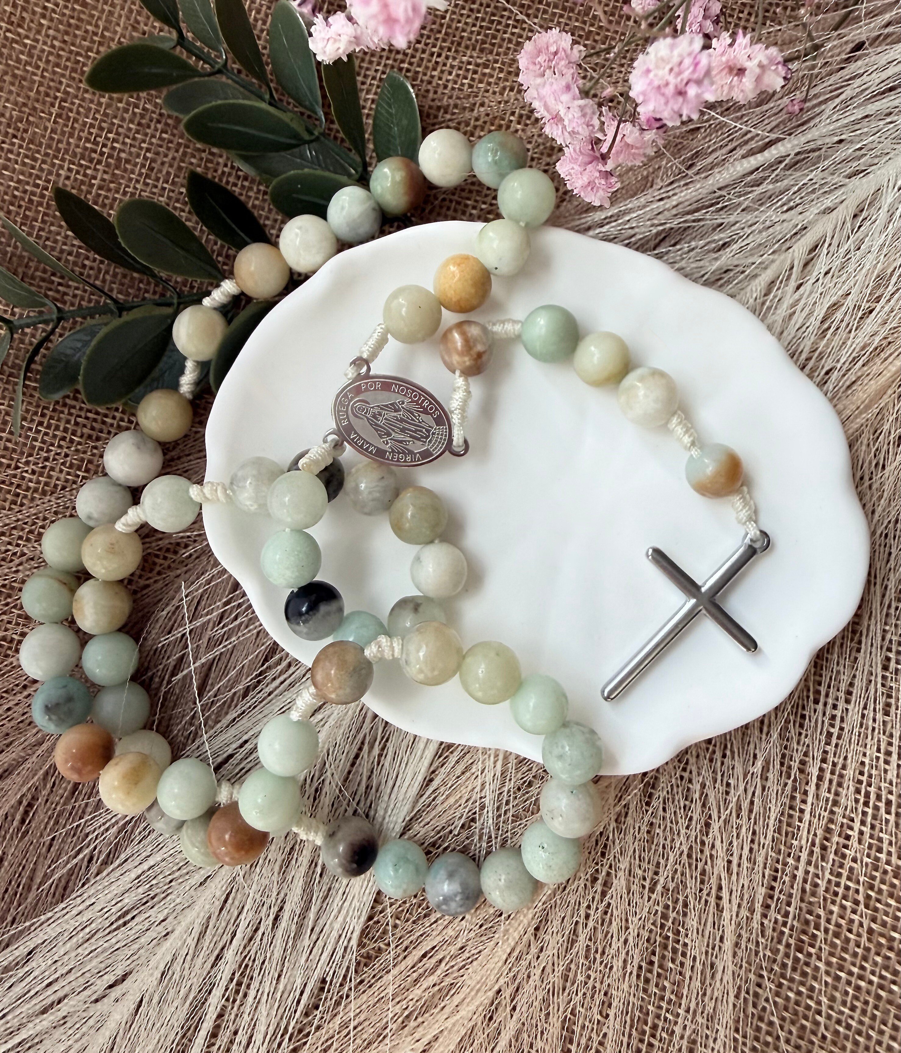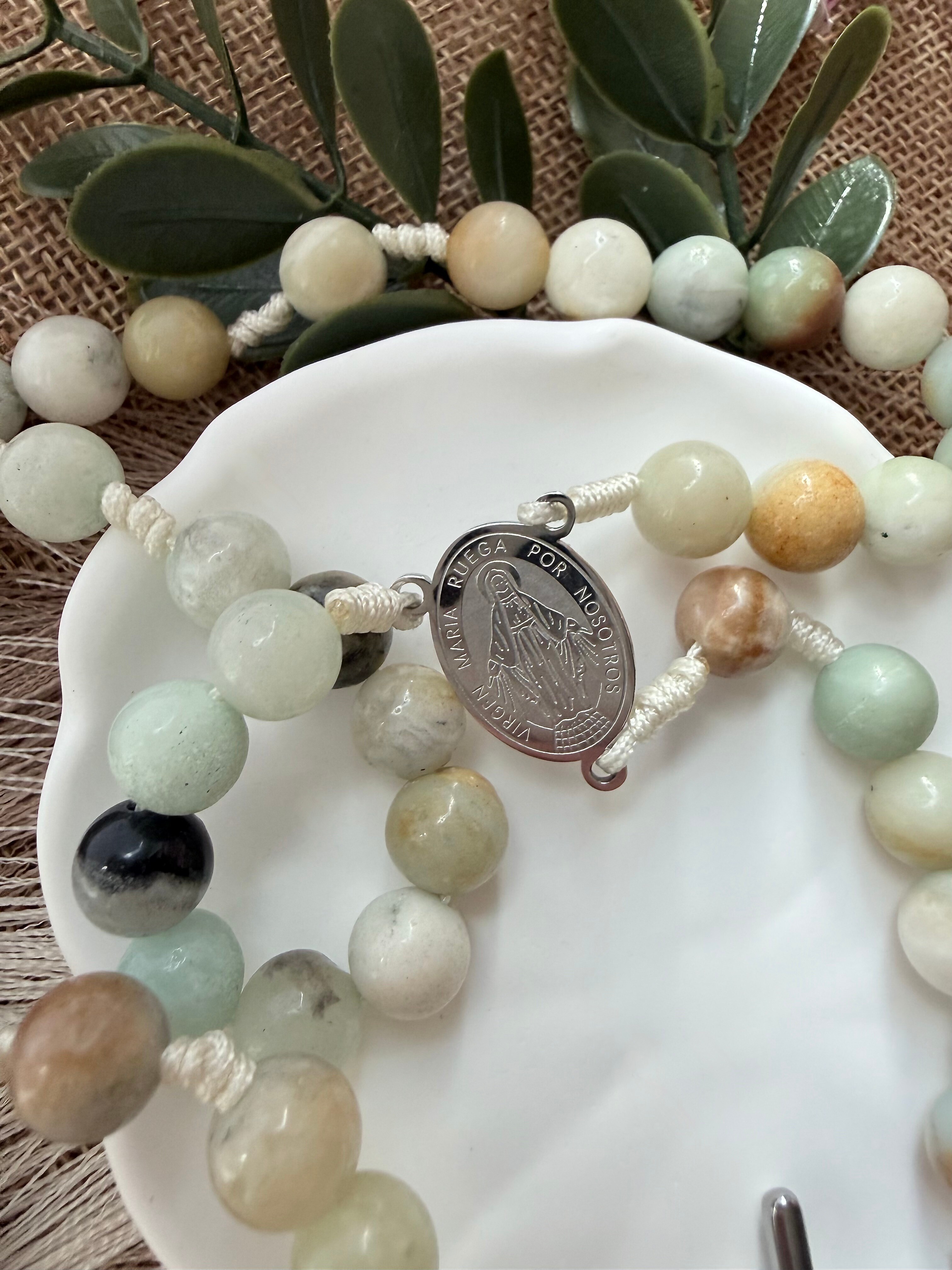 Inspiracją dla tego różańca była biblijna "Woda Żywa". Amazonit to kamień o niezwykłej barwie – połączenie turkusu, mięty, błękitu i odcieni brązu. Kojarzy się z wodami Jordanu i świeżością poranka. Model "Źródło Nadziei" stworzyłam dla serc spragnionych pokoju. Modlitwa na nim jest jak zaczerpnięcie głębokiego oddechu. Jego kolor uspokaja myśli, a srebrne elementy przypominają o świetle, które zawsze zwycięża mrok.