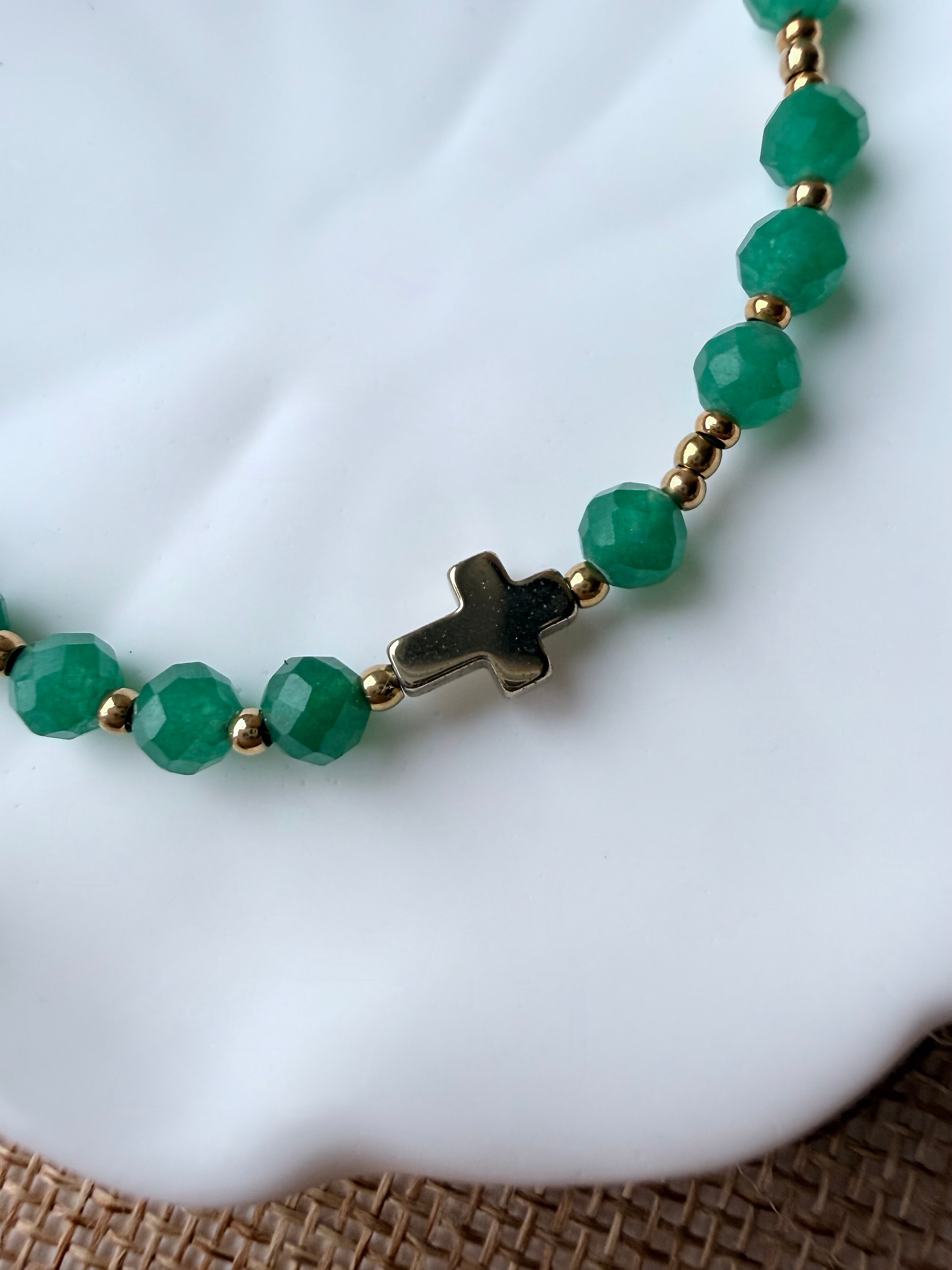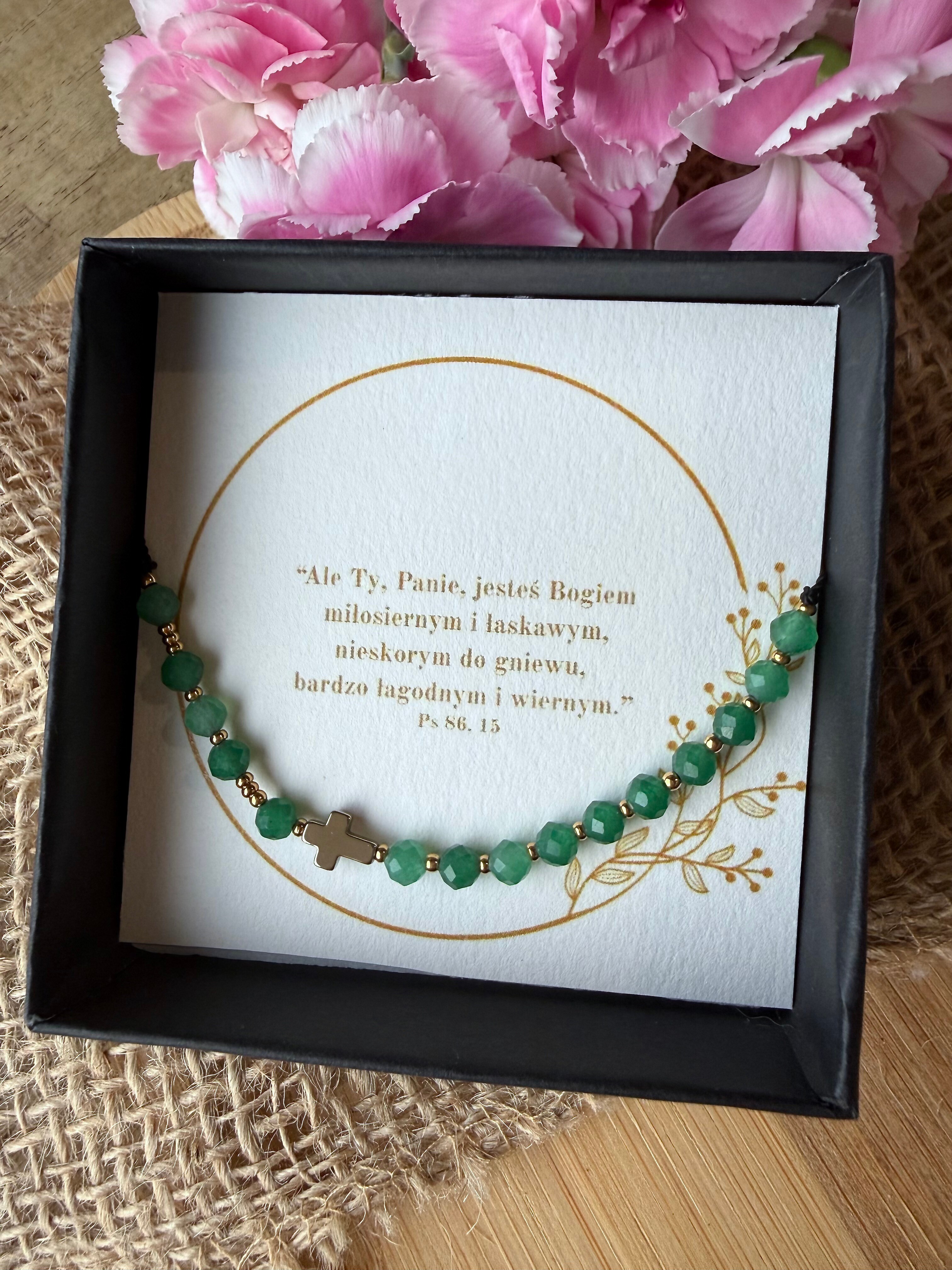 "Żywa Nadzieja" to bransoletka inspirowana słowami św. Piotra. Zieleń od zawsze symbolizuje życie, wzrost i nadzieję, która nie umiera nawet w trudnym czasie. Soczysta barwa awenturynu przypomina o tym, że po każdej zimie przychodzi wiosna, a Bóg ma dla nas plan pełen dobra. To "szept", który dodaje otuchy, gdy czekasz na dobre wieści lub potrzebujesz siły do działania.